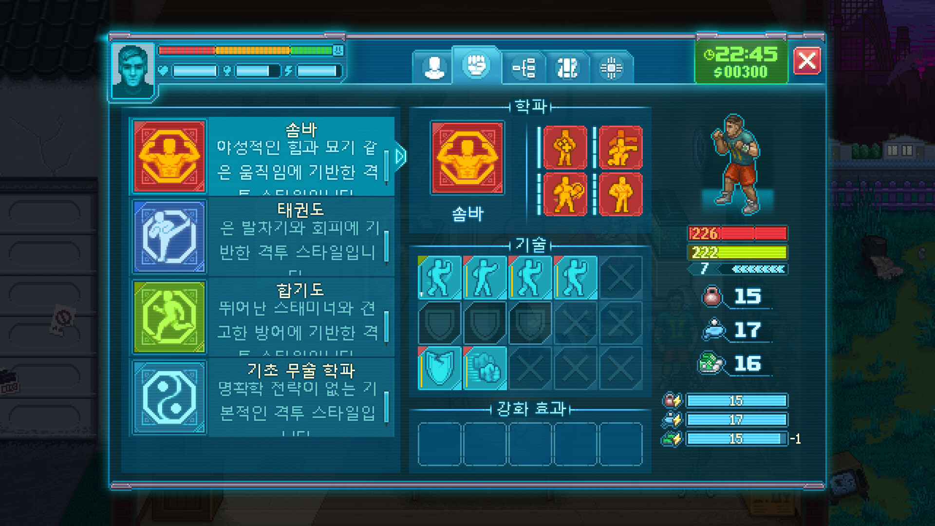 원하는 만큼 펀치와 킥 및 속임수를 동원하세요. 최고의 파이터가 되는 것은 쉽지 않습니다. 시간과 노력과 자본과 훈련이 필요하죠. 능력치와 기술을 향상하고, 경기를 준비하고, 세상에 하나뿐인 멋진 나만의 전투 학교를 만드세요! 패배와 비웃음의 대상이 되는 것보다 낫겠죠. 피땀눈물을 쏟는 클래식한 훈련을 능가하는 것은 없지만, 신경 훈련 및 불법 소프트웨어는 확실히 유혹적으로 들립니다.사기꾼이라는 사실이 들통나 마지막 남은 뇌세포를 잃게 될지 모르는 작은 위험이 있긴 하지만 말입니다.