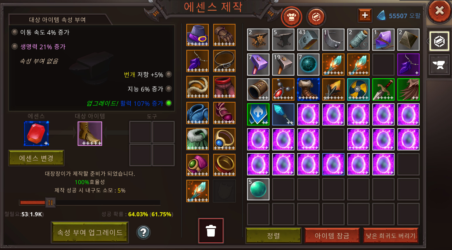 대장간에서 에센스를 사용하여 항목 간 통계를 병합하고, 항목을 분해하고, 유물을 사용하여 장비를 더욱 강화하십시오!