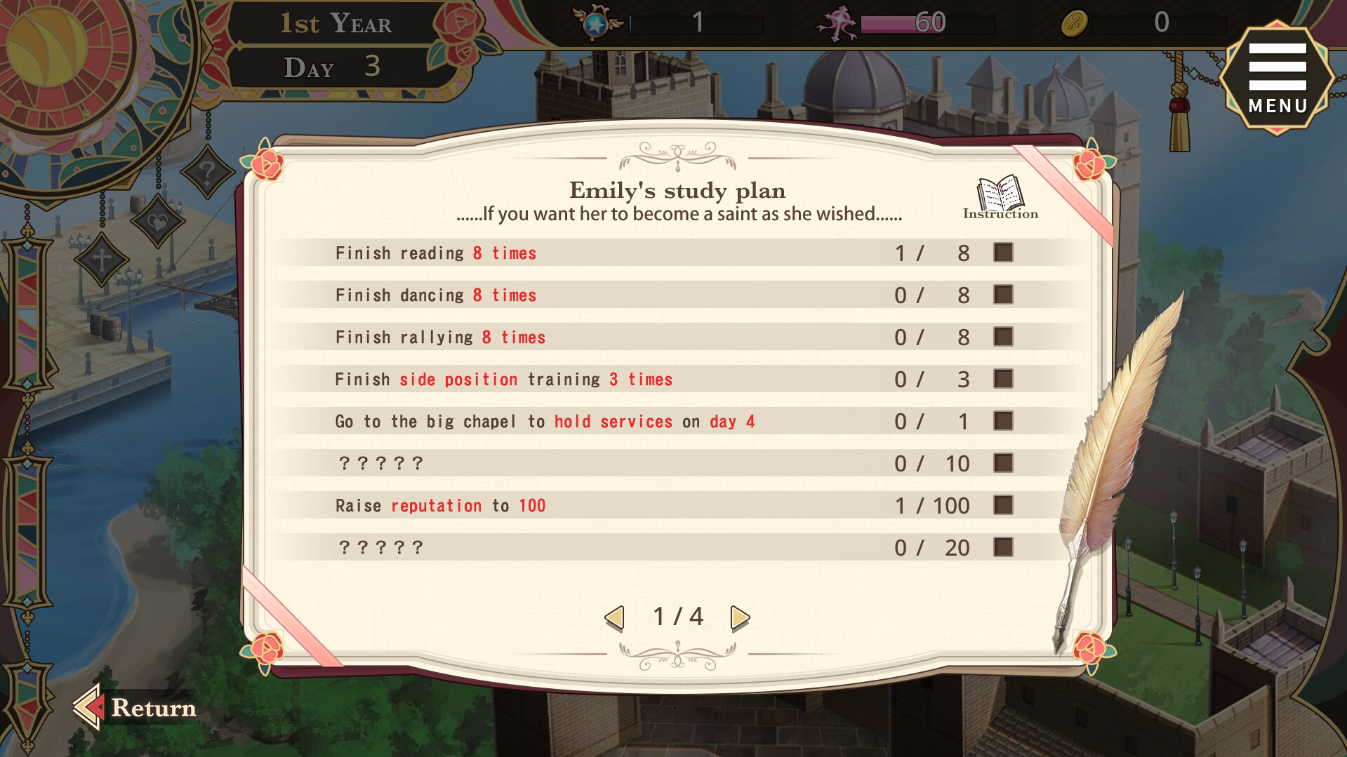 Every day is divided into three time periods. Players will take on the role of the bishop of Kynaston Town. Within two years, he should guide and train Emily to carry out various activities in the church or go out onto the streets to try various jobs and increase their income. Some actions will be unlocked as the plot develops.