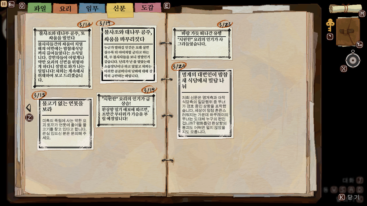 2.1 게임 중 이름 있는 환상향 인요가 등장하게 되면 노트에 기록됩니다. 출현 장소, 선호 취향, 속마음 등 이야기와 유용한 정보가 함께 적혀 있습니다.