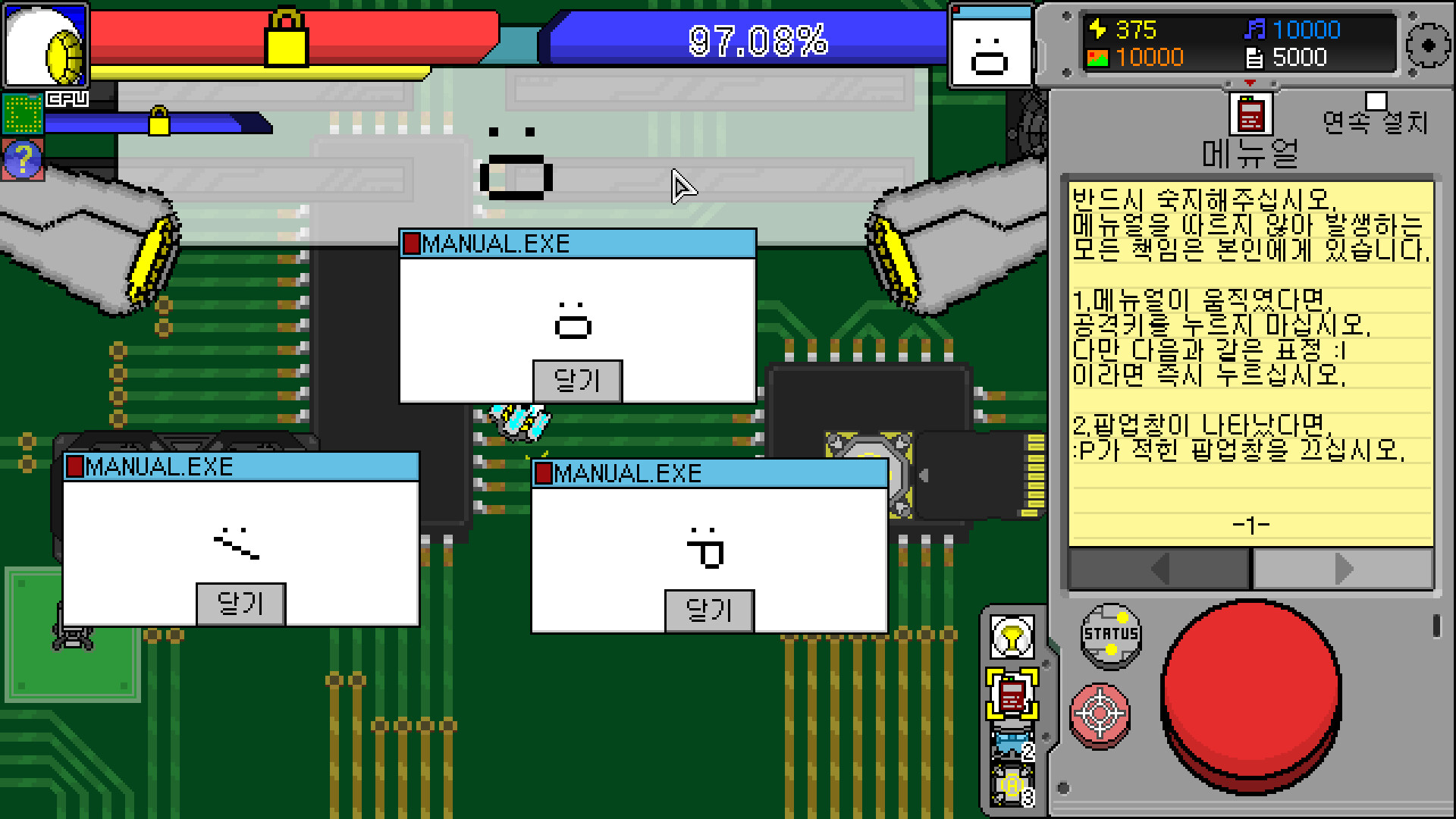 클리너에서 체력을 회복하고, 그림판으로 이미지 파일을 생산하며 웹 브라우저를 깔아 맵 곳곳을 살피는 등 다양한 블럭과 상호작용 해보세요.