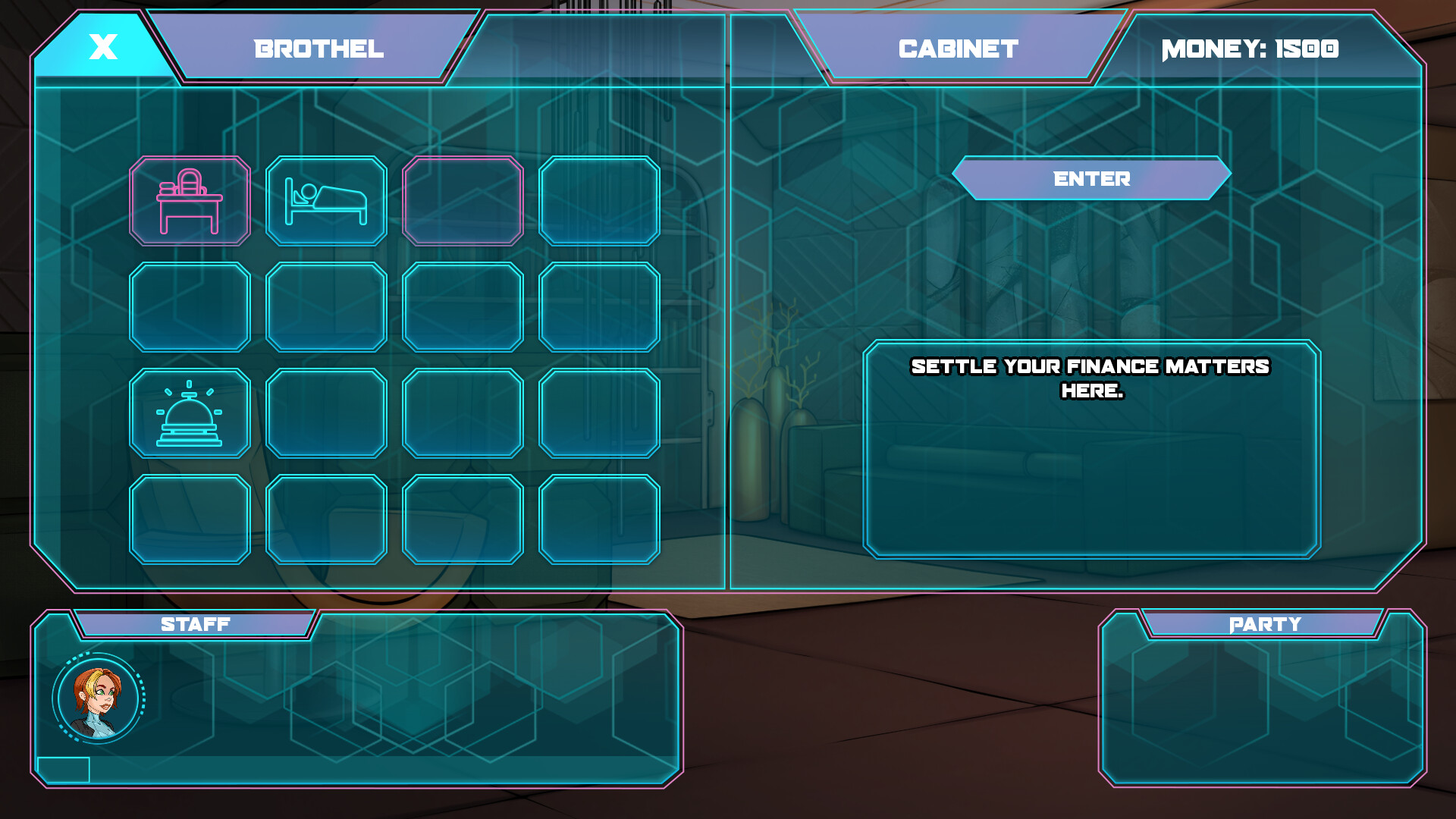Welcome to a sci-fi/cyberpunk universe where you run an adult brothel in a full brothel management simulator. Build your brothel from the ground up by adding new rooms to increase your staff capacity, keep staff happy, and provide unique services to clients. You can also customize your characters with different clothes, hairstyles, and weapons. In this game, you can earn experience points and a reputation through a turn-based combat system, running your brothel, and "interacting" with beautiful women. Level up your character and staff to better serve clients or fight off thugs. Take over the city by fighting gangs and upgrading your brothel.