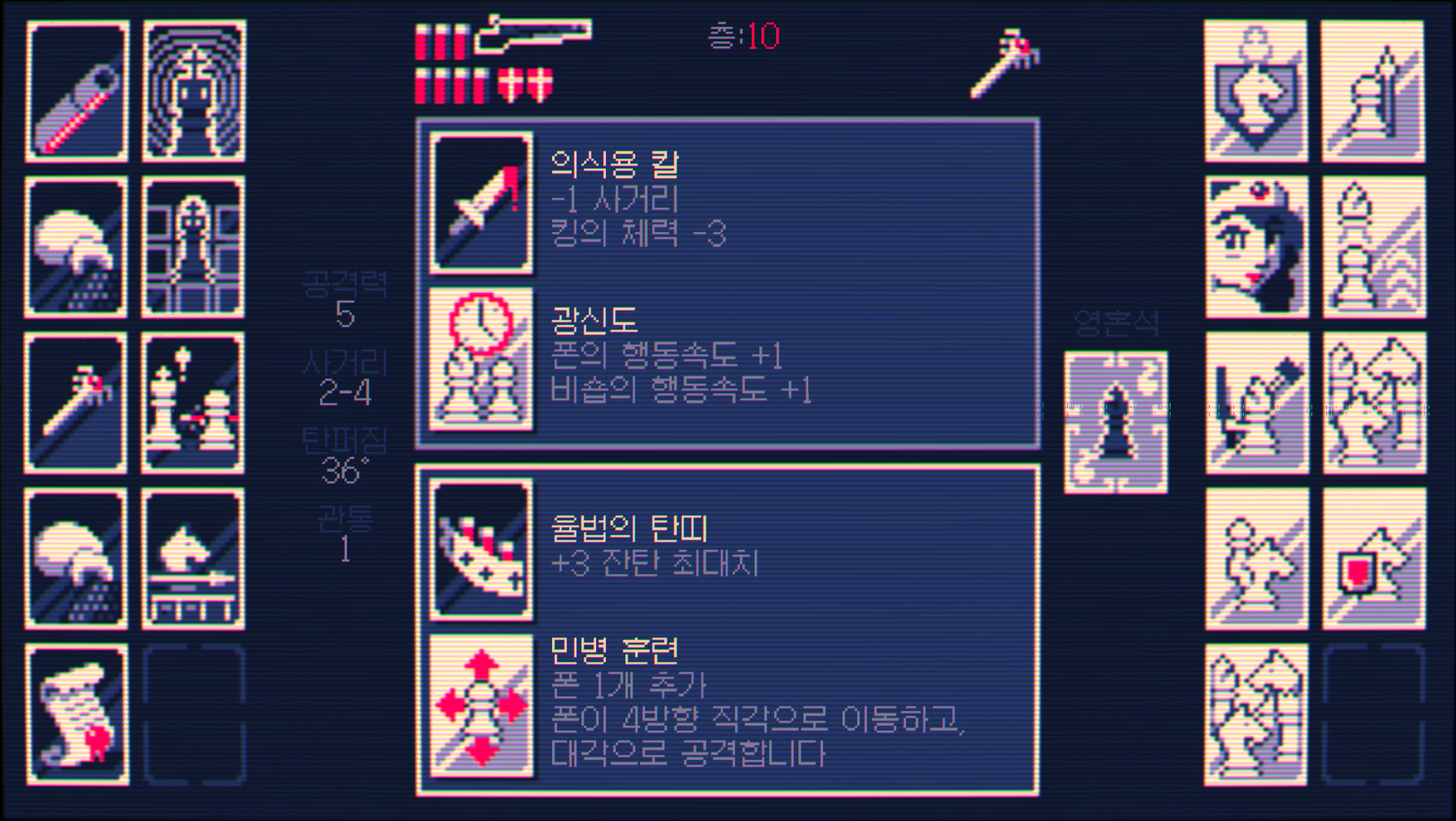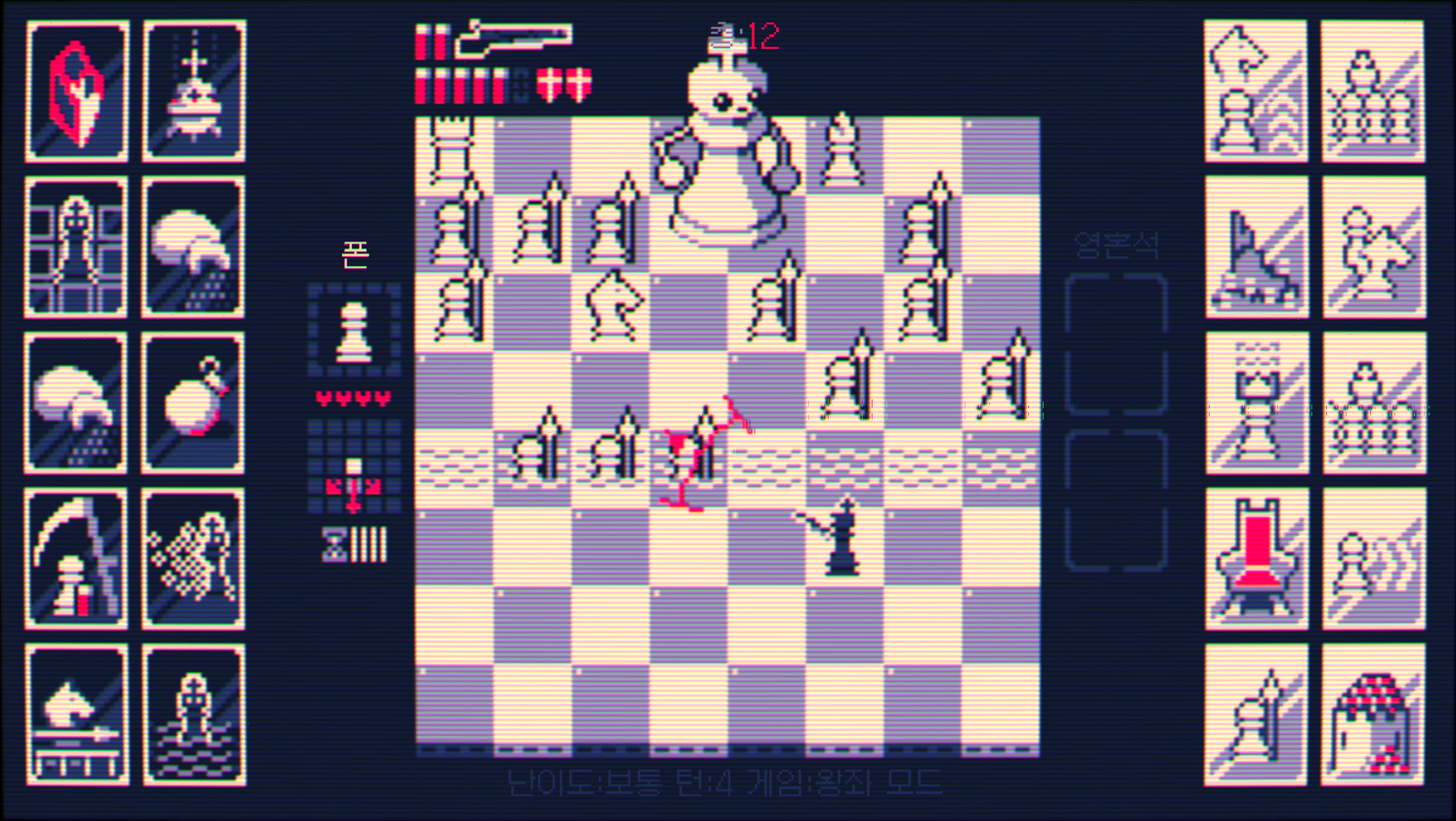 차례가 올 때마다 킹을 움직이거나 적을 향해 산탄총을 갈겨버릴 수 있지만, 총을 재장전하려면 귀중한 한 수를 소모해야 합니다. 체크메이트를 피하며 백색 킹을 처치해 한 층을 완료하고, 다음 층으로 나아가세요! 한 층을 완료할 때마다 두 가지 선택지가 주어집니다. 각 선택지마다 흑색 킹과 백색 킹의 군대를 강화하는 업그레이드가 하나씩 포함되어 있습니다. 탑을 올라 왕좌를 되찾으려면 신중하게 선택해야 할 것입니다.