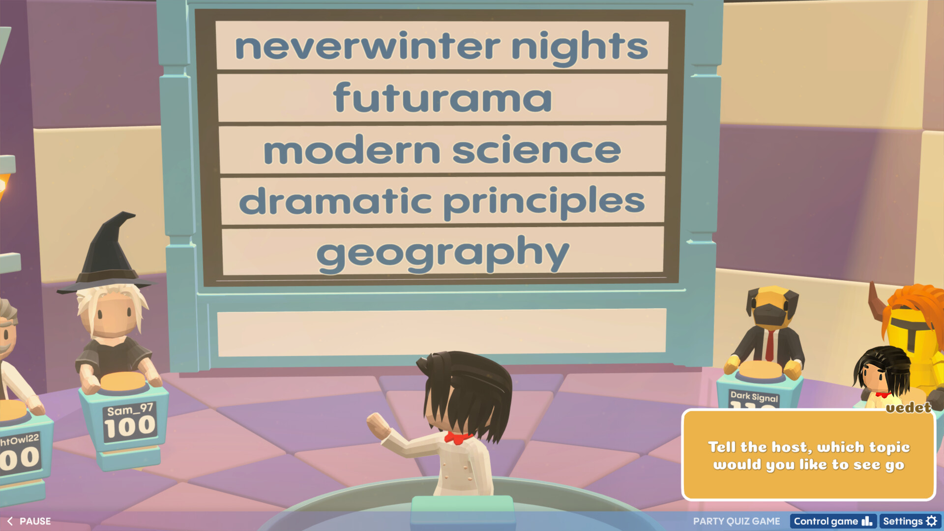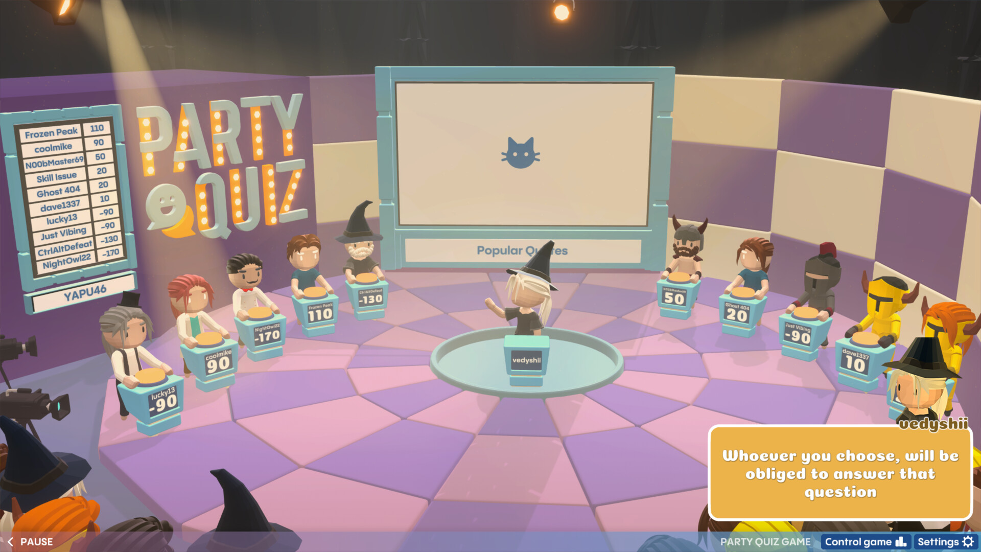 Everyone can try to be both a Player and the Host, with fun avatars to choose from