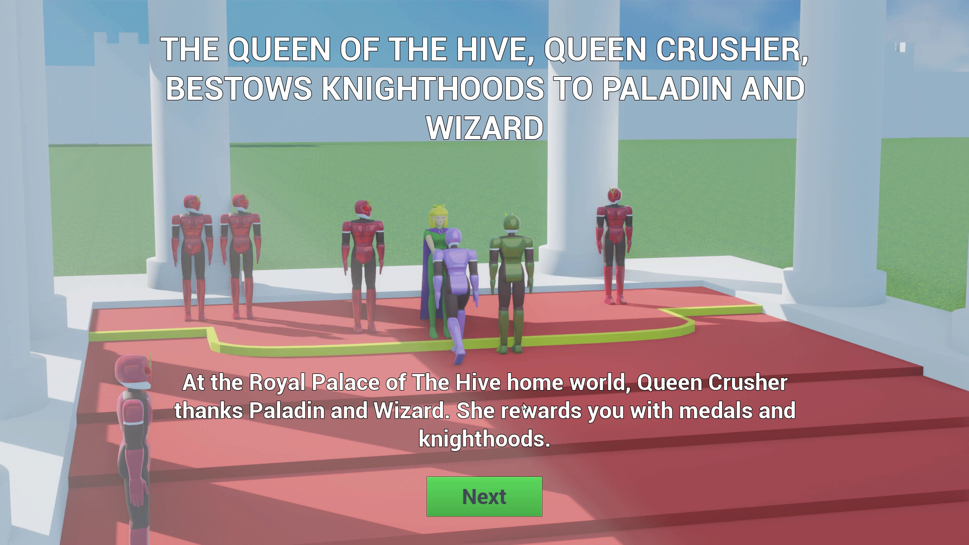If you are able to vanquish King Nimrod and his forces, you and Wizard will be summoned by Queen Crusher to her Royal Palace on The Hive planet. There Queen Crusher will reward you and Wizard with medals and knighthoods.