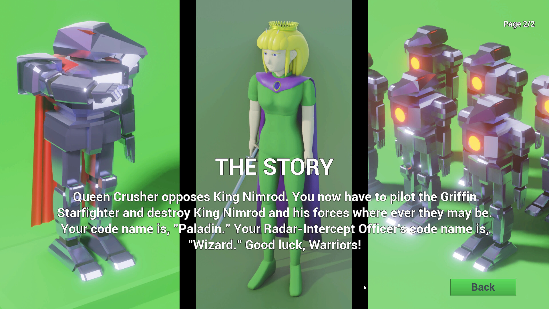 You are Paladin, a heroic starfighter pilot who flies the legendary Griffin Starfighter. You are from a fictitious exoplanet called The Hive which is located light-years away from the Earth. The evil King Nimrod and his forces from an undisclosed exoplanet in a galaxy somewhere in the universe are conquering the universe. The leader of The Hive, Queen Crusher, opposes King Nimrod. You and your Radar-Intercept Officer code named Wizard now have to fly in the Griffin Starfighter and restore peace in the universe by vanquishing King Nimrod, all of his forces and all of his assets wherever they may be. The despicable King Nimrod and his forces are mechanical extra-terrestrial (E.T.) lifeforms known as the Raptorbots, while you (Paladin), Wizard and Queen Crusher are insectlike extra-terrestrial (E.T.) lifeforms known as the Hivians.