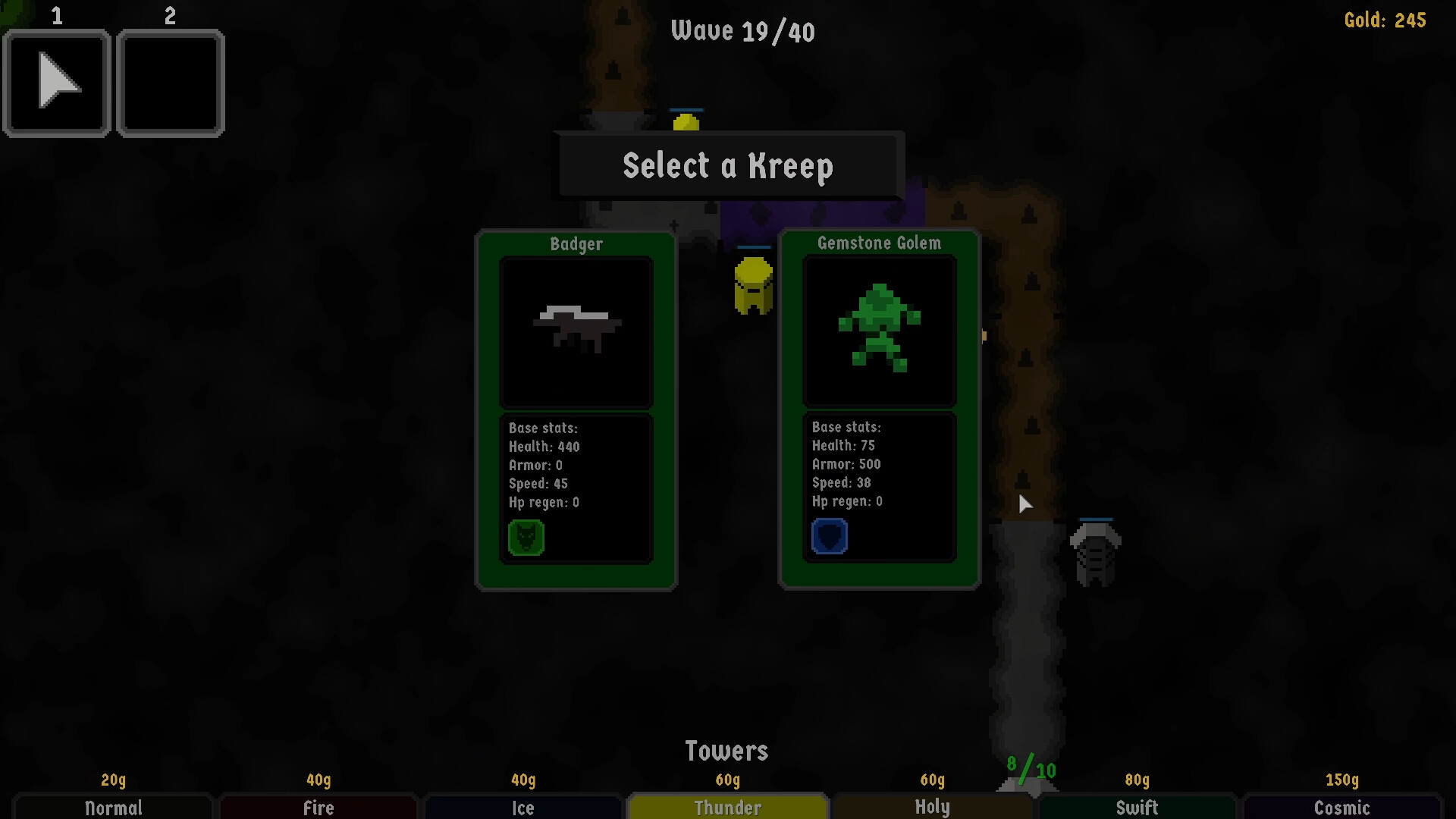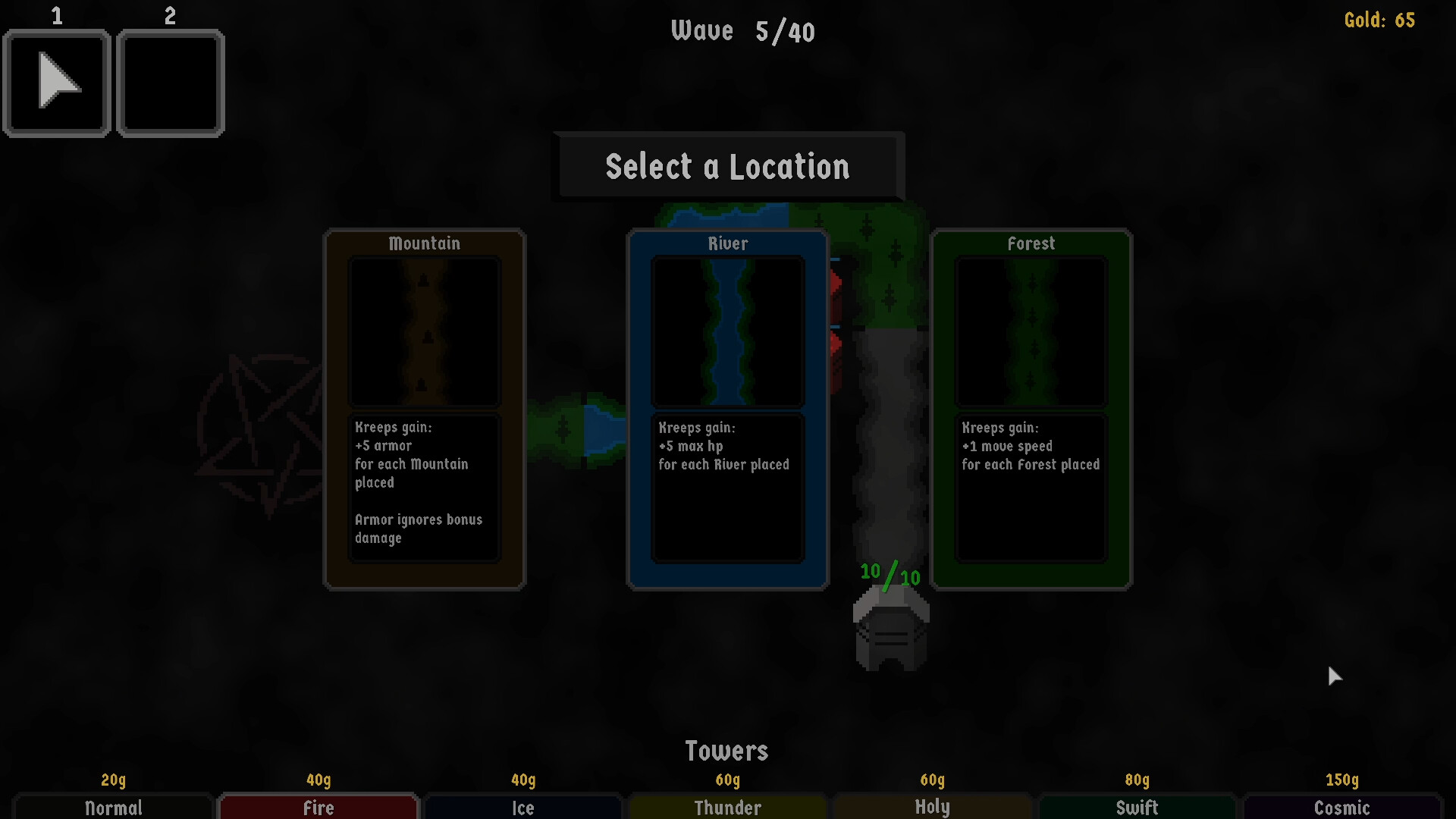 1. Select a locationLocation choices give all Kreeps a permanent buff and also extend the path. These buffs stack as the game progresses.