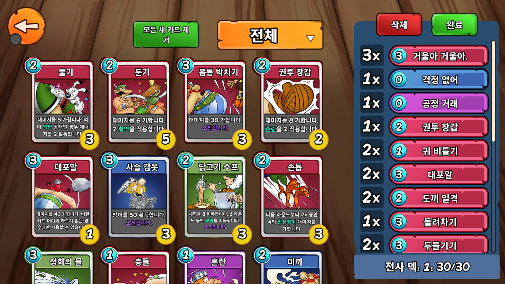 덱 빌딩의 팬과 아스테릭스 시리즈의 팬 양쪽을 모두 기쁘게 할 수 있도록 설계된 이 게임에서는 제공되는 150종의 카드 중 30개의 카드를 선택해서 덱을 만들게 됩니다.