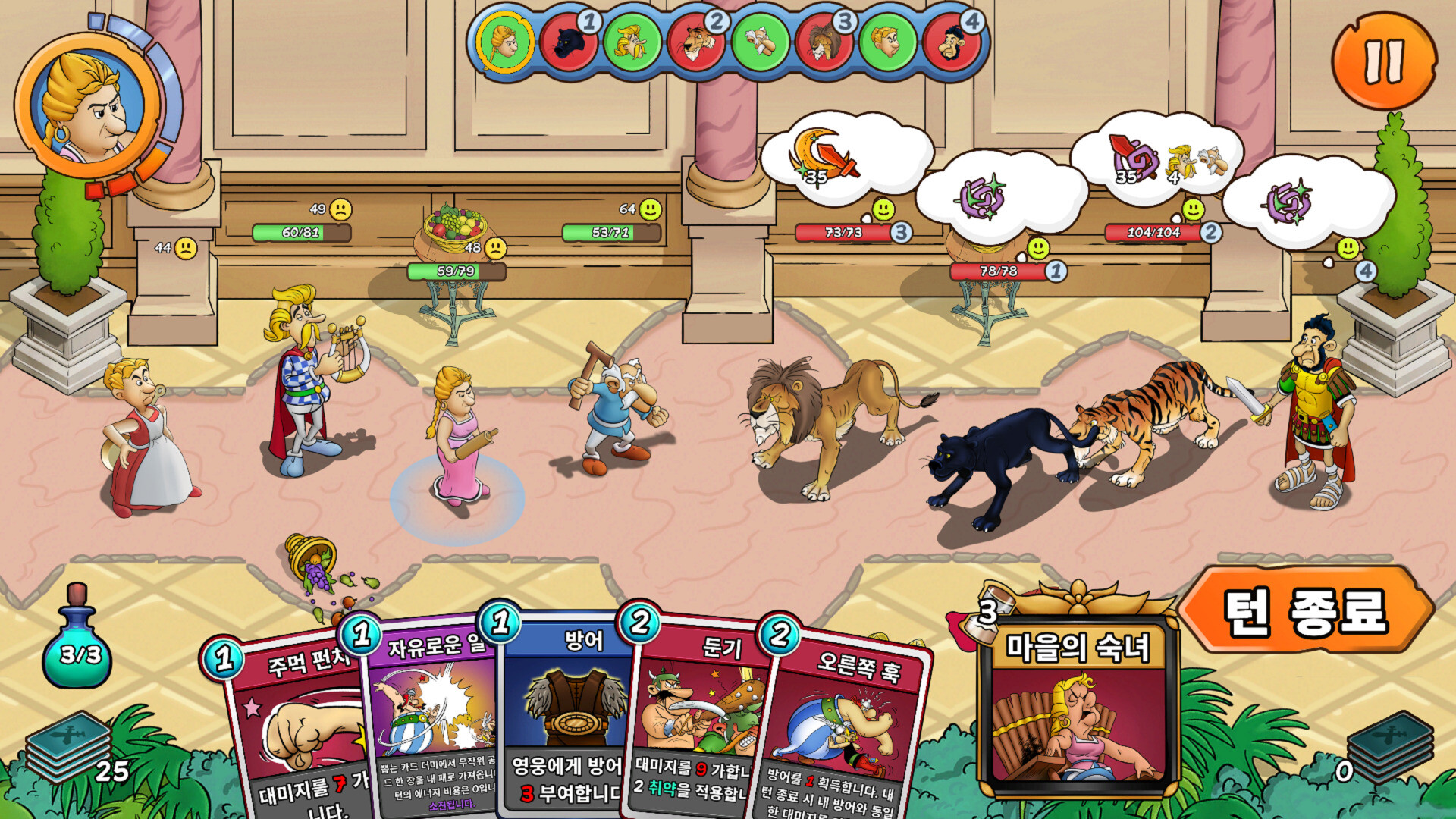 다양한 지역에서 모험을 겪으며 최대 24명의 영웅을 잠금 해제해 보세요. 각 캐릭터는 독특한 특성 및 궁극의 스킬을 가지고 있습니다. 예를 들어 아스테릭스의 ""타고난 반항아"" 스킬은 로마인들을 상대로 그들의 공격 정밀성을 떨어트리는 등 효과가 좋고, 도그마틱스의 ""영역 표시""는 상대에게 겁을 주고 동물을 완전히 기절시킵니다! 그러니 적에게 딱 어울리는 영웅을 골라야 합니다.