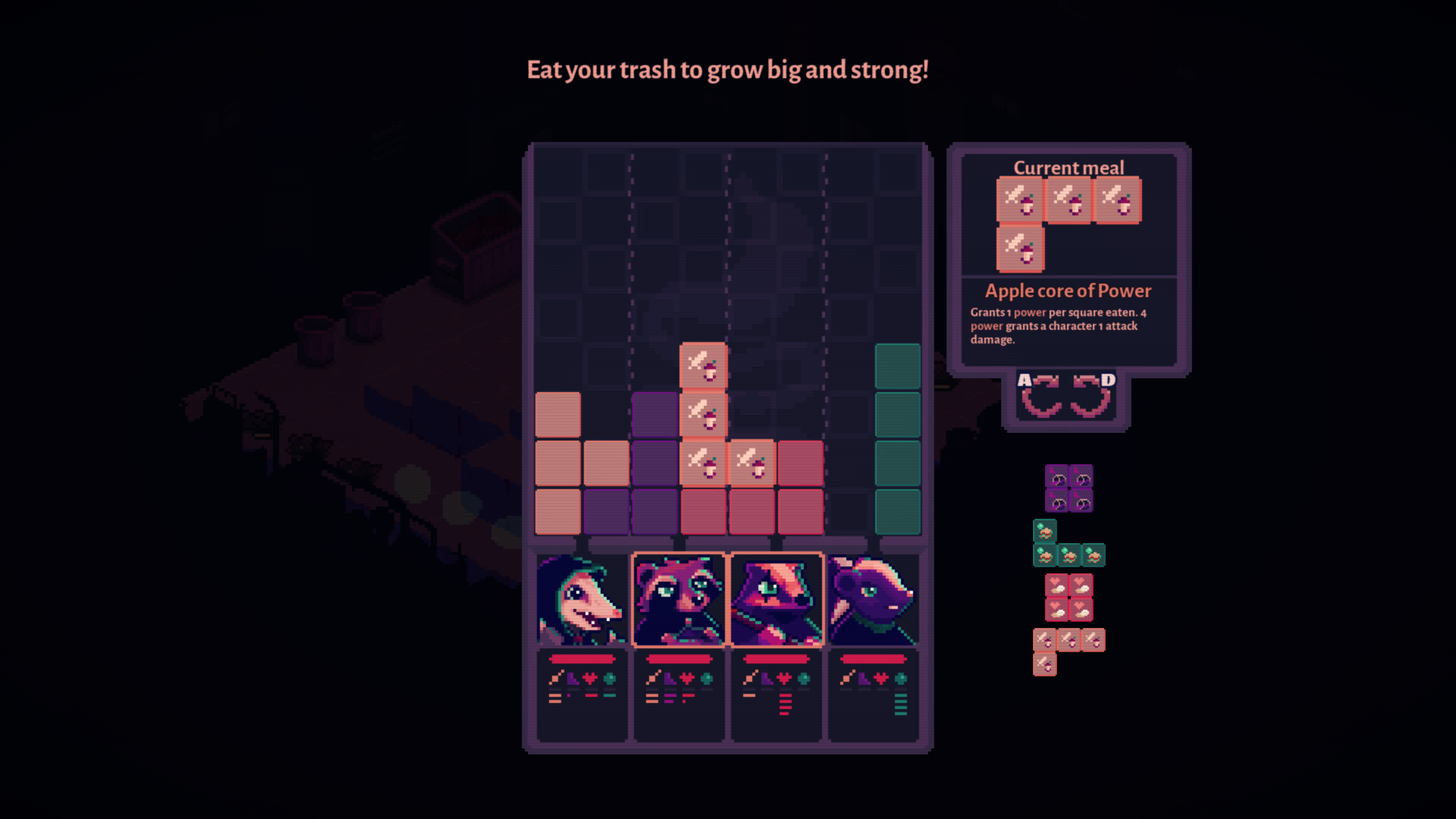 I know, pretty great huh? Each level, you defend some dumpsters full of delectable goodies from the RAT CRUE, and if you lose too much trash to them then idk they'll probably use its magical powers to summon a decaying trash god or something I DON'T KNOW IT WON'T BE GOOD.