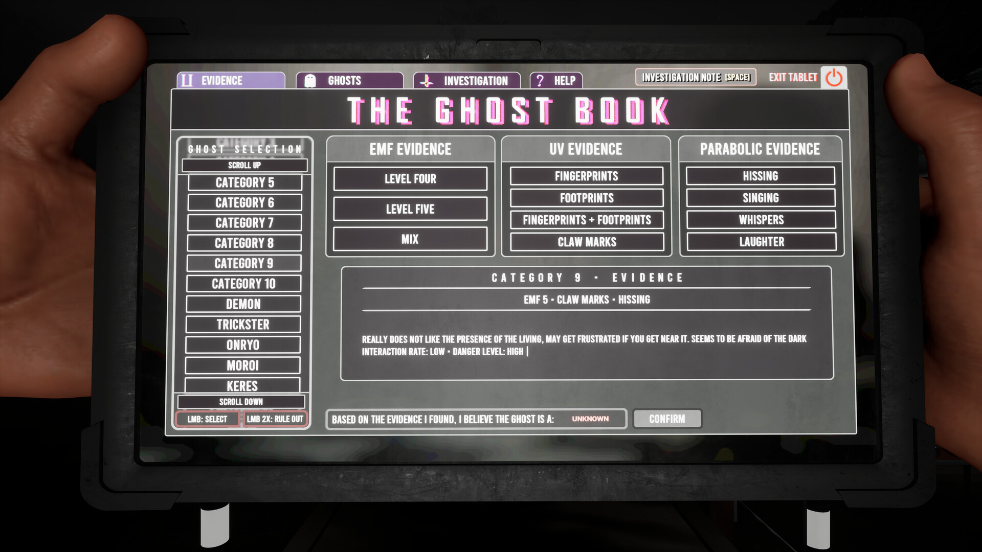 1. Identify one of 30 ghost types by using your EMF Reader, Parabolic Microphone, and UV Light.