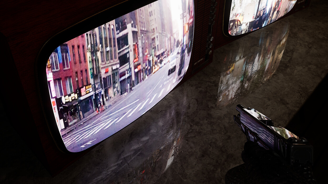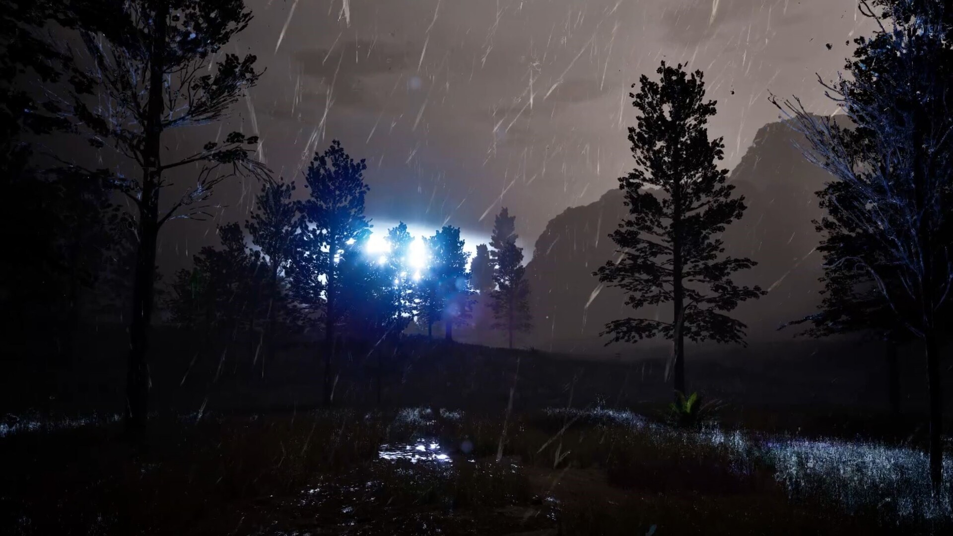 Dynamic Day/Night Cycle with Dynamic Weather, Volumetric Clouds & Fog, Visual Effects, & Sounds with over 15 different weather variants including blizzards, thunderstorms, hurricanes, light snow, heavy fog, dust storms, and more. When its raining you can see the water dripping off your weapons/gear, tree trunks, cars, foliage, buildings, gloves, sleeves, everything and when its snowing you are also able to see the snow attach to everything the rain does like buildings, weapons, gear, etc. The Player, Rake, and all other movable objects can also create paths in the snow or ripples in the puddles on the ground too.