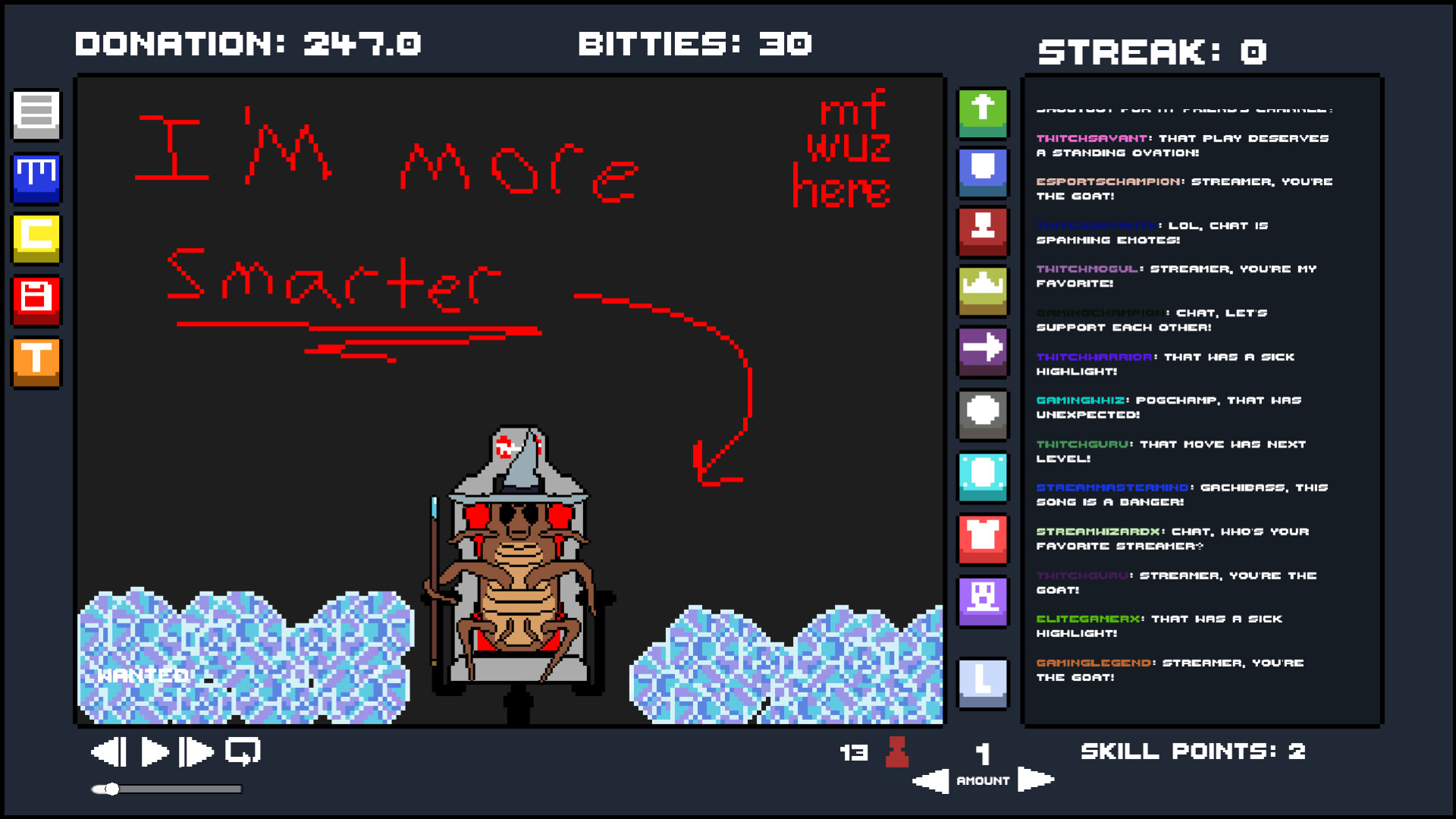 In this parody of popular streamers! Play as your favorite content creators like Mokipane, Asmondsilver and CQX. Form a cult! Squeeze your pay piggies, start drama, appease chat and rake in the dough. Earn bitties by performing actions for chat, collect the fallen bits using various stream upgrades that multiply their values. Use the money earned to buy upgrades for stream, random temporary upgrades that boosts every drop of money from your following, Buy different streamers and play minigames!