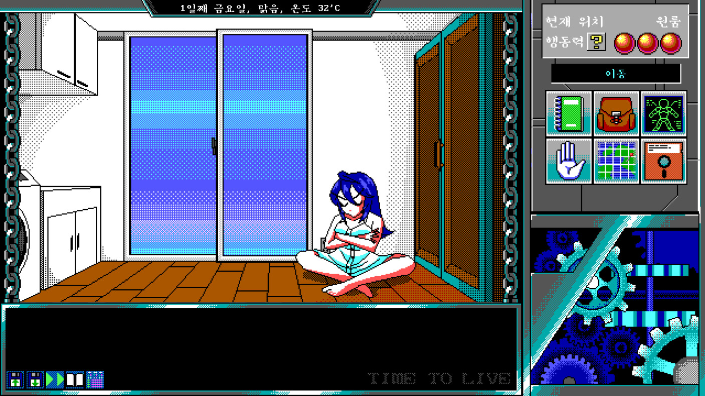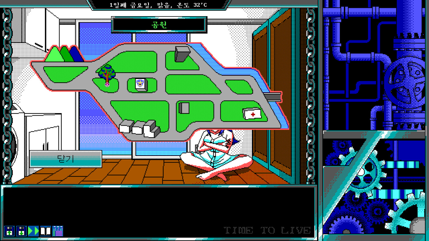 Time To Live의 그래픽은 EGA의 표준 16색만을 사용해 만들어졌습니다. 아는 분들은 향수를 느껴보시고, 모르는 분들은 놀라운 16색의 세계를 경험해보세요.