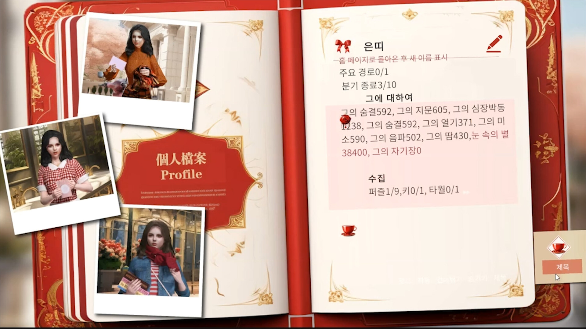▌게임 플레이 - 이야기 보기/선택하기: 영화를 보는 듯한 이야기를 즐기며 왕자와의 로맨스를 진행합니다. 그의 미소, 심장박동, 따뜻함 등을 수집하여 다른 방을 언락하고 퍼즐을 풀 수 있는 단서를 찾습니다. - 미니 게임: 왕자에게 패치를 붙이는 등의 미니 게임을 통해 중요한 조각들을 수집하여 퍼즐을 해결합니다. - 일상적인 상호 작용 및 동반: 전화, 메시지, 일기 읽기 등을 통해 왕자와 상호 작용합니다. - 노래와 비디오 클립: 이 노래를 듣고 중요한 비디오 클립을 검토합니다..