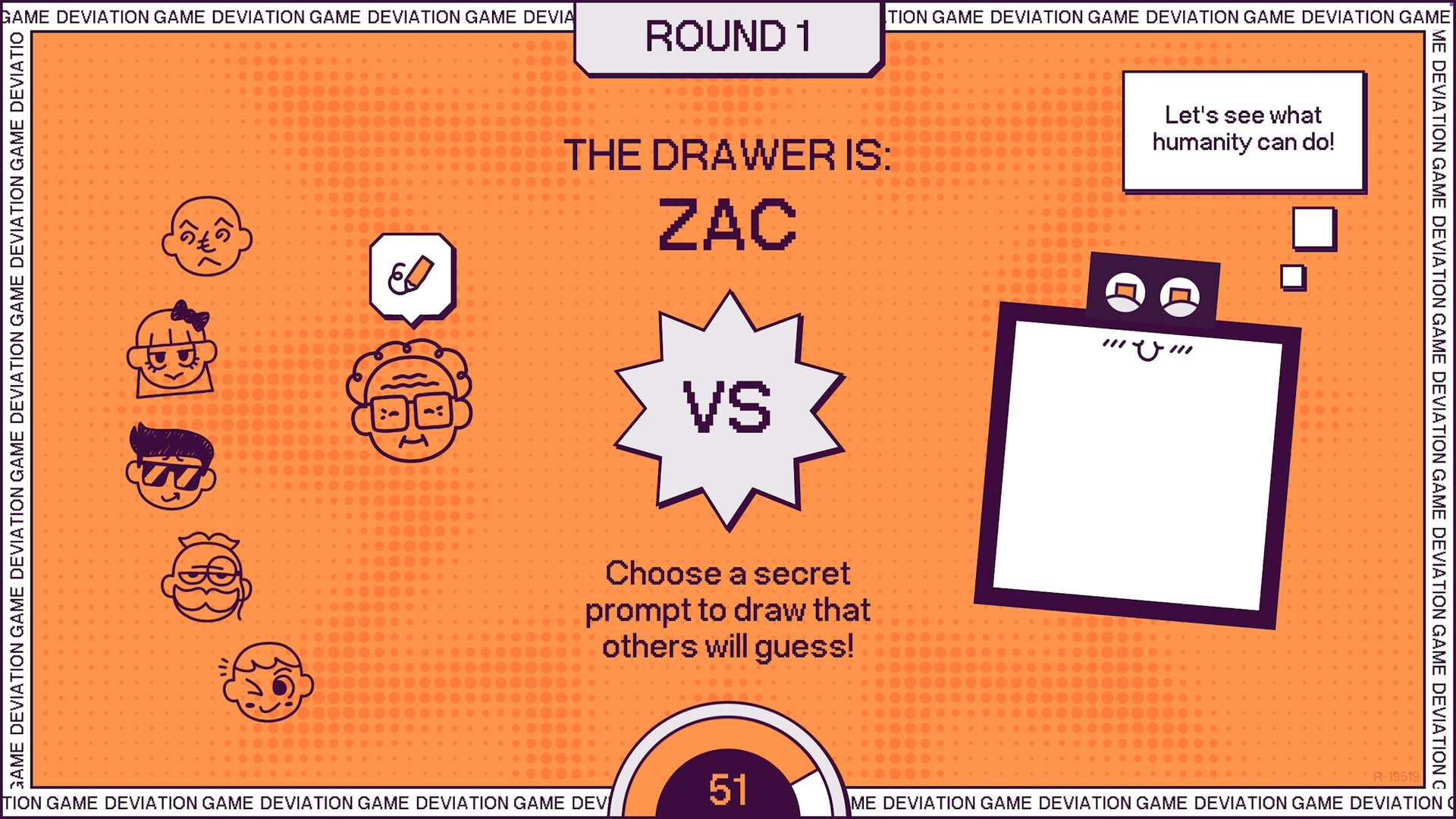 By embracing the medium of games, Deviation Game aims to use AI as a collaborative tool that seeks not to replace human creativity but to enhance it. Through the game, players learn to express themselves in new ways to deviate from what the AI has already learned, making for a fun and brain-teasing party experience, where you’ll create things no one has ever seen before! Flipping Alan Turing’s revolutionary 1950 Imitation Game on its head, Deviation Game encourages players to fool the AI instead of the AI trying to fool them.