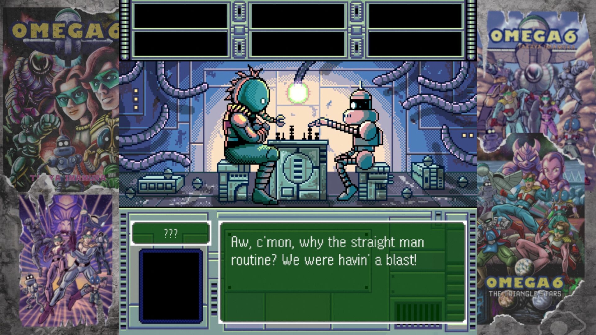 전직 Nintendo 아트 디렉터에서 만화 아티스트로 변신한 타카야 이마무라와 Retro Mystery Club 시리즈, Happymeal의 개발자를 통해 16비트 스타일의 레트로-퓨처, 어드벤처에 RPG 요소를 담은 OMEGA 6: The Triangle Stars가 탄생했습니다.