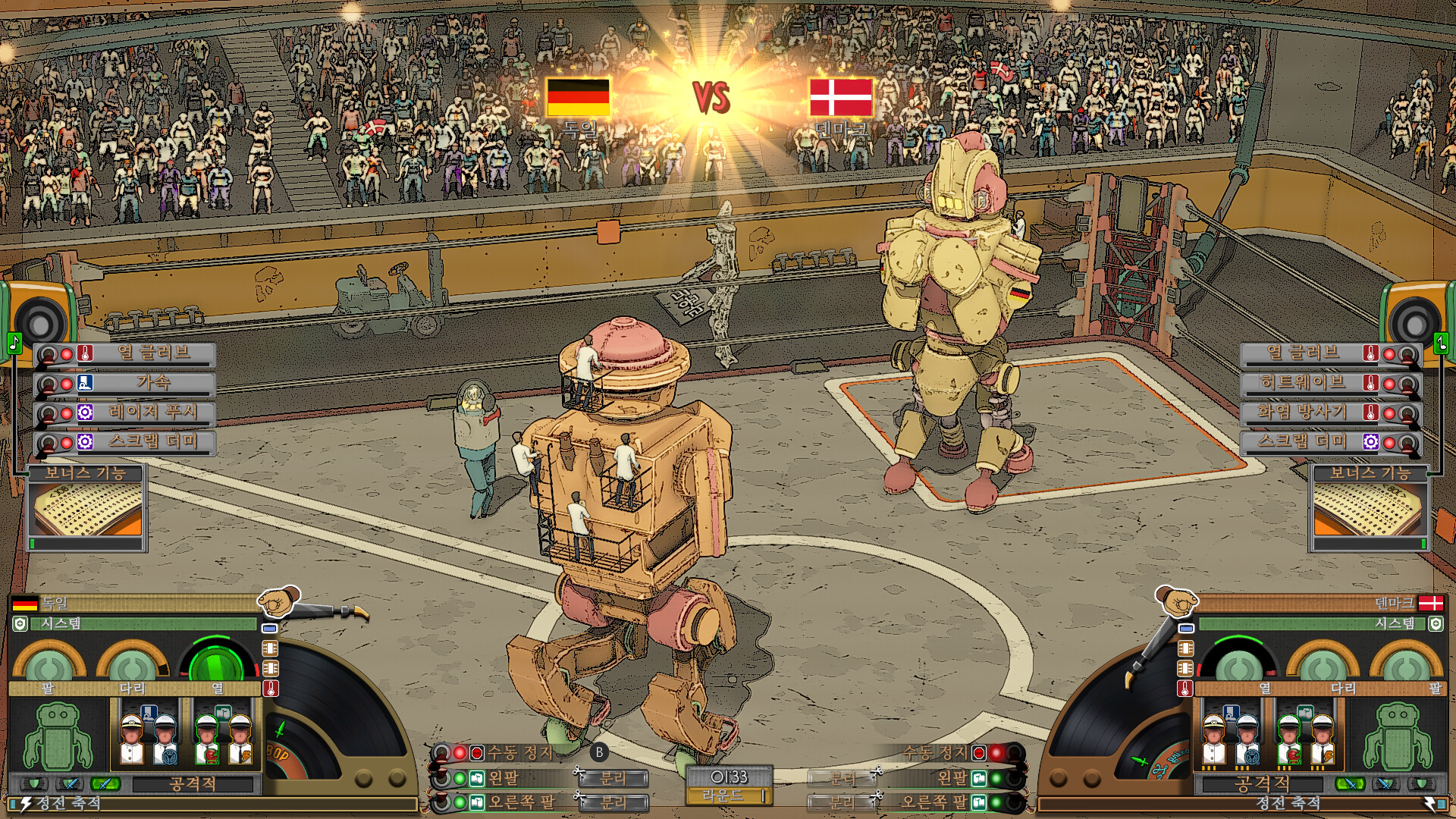 빈티지 아톰펑크/일렉트로 스윙 스타일의 오토 복싱에서 랭크를 올리고 최강의 로봇 파이터들의 자리에 도달하세요!🎵 로봇 복서의 소속 국가와 외형을 선택하고 펀치 카드 어빌리티, 리그 벨트 및 로봇 파츠를 통해 다양한 행동 특성을 부여하거나 속도, 힘, 내구도를 강화할 수 있습니다.