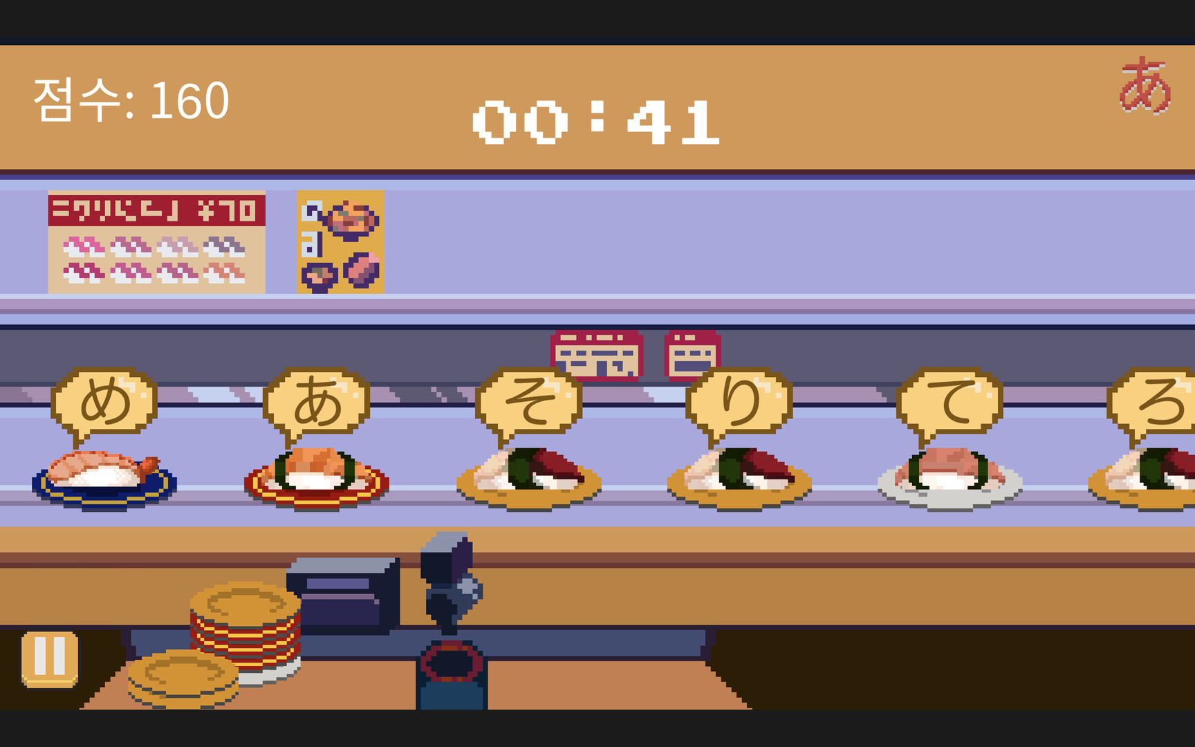 회전초밥 도전: 회전 벨트에 올라오는 히라가나·가타카나를 보고, 해당하는 로마자(로마지)를 입력하거나 클릭하세요!