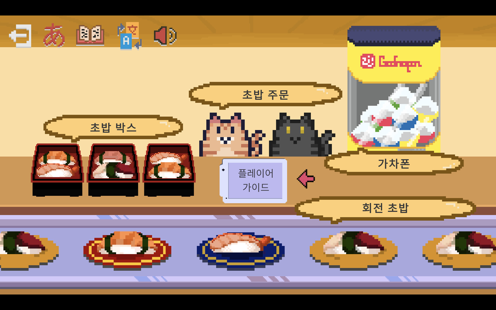 고양이 손님 주문 모드: 귀여운 고양이 손님의 음성을 듣고, 알맞은 가나와 일치하는 초밥을 선택해 보세요.