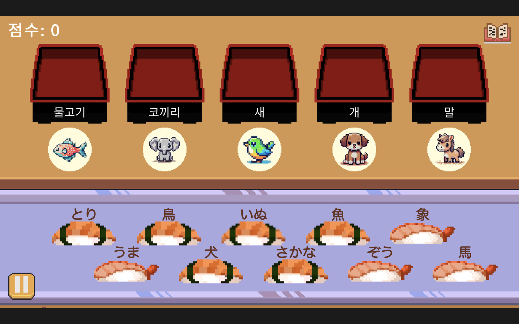 스시 상자 분류 게임: 가나 또는 한자가 적힌 초밥을 뜻이나 이미지와 연결해 매칭하세요!