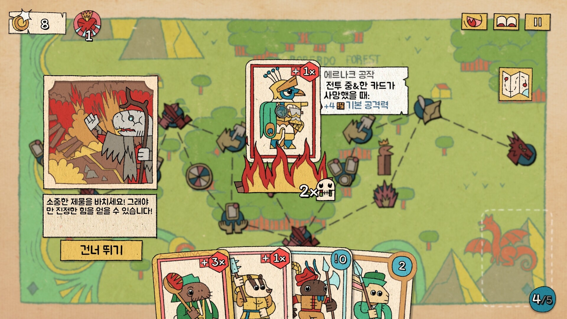 짐의 군대는 매우 다양하다 (즉, 카드의 종류가 풍부하다는 뜻이니라). 우스꽝스러운 동물부터 용감한 전사까지, 너희는 다양한 조합을 통해 짐만의 꿈의 군단을 구성할 수 있다! 그들 대부분은 저마다 고유한 능력과 속성을 지니고 있느니라. 이를 잘 활용하여 최고의 효과를 발휘하도록 하라! 때때로 희생은 필요하느니——그들은 짐의 위업을 이루기 위한 디딤돌일 뿐이다! 진정 고민해야 할 것은, 어떻게 하면 최고의 조합으로 최고의 성과를 낼 수 있느냐 하는 점이다!