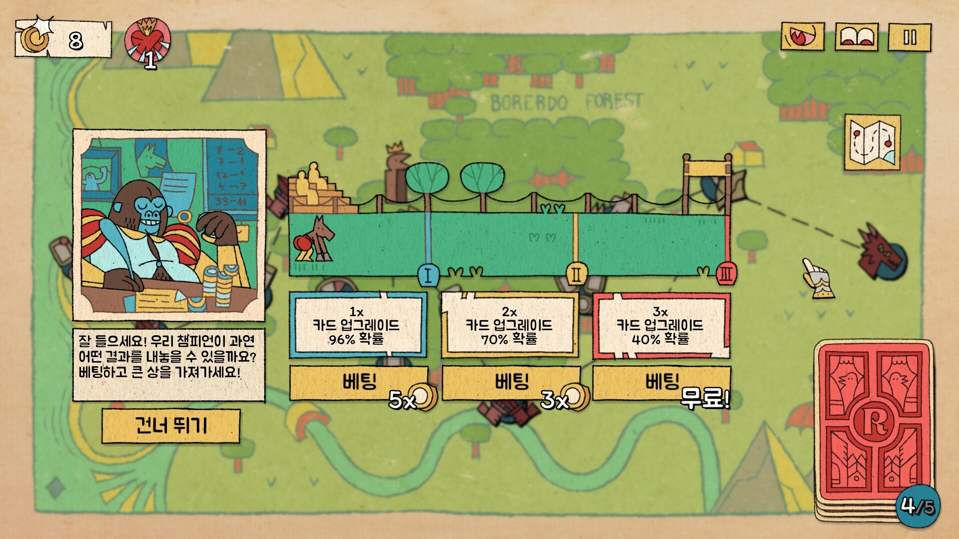 짐과 같은 위대한 왕의 일상을 체험할 수 있다니, 너희에게는 참으로 크나큰 영광이로다! ‘왕의 칙서서’를 휘두르며 전장을 좌지우지하라! 감히 소란을 피우는 잡것들을 왕좌로 소환하여 재판하거나, 카드 군단을 지휘해 적의 영토를 휩쓸어버려라. 너희는 짐이 계책을 펼치는 짜릿한 쾌감을 직접 체험하게 될 것이다!