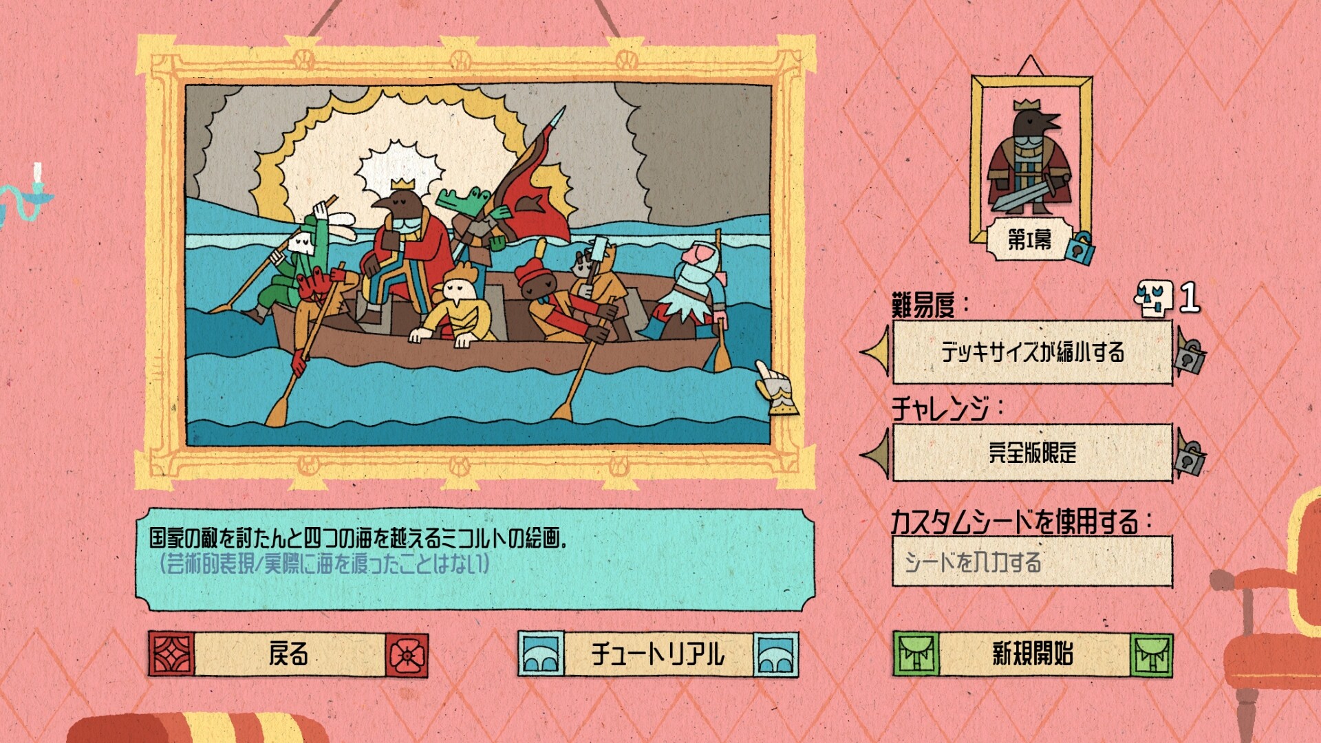 이 위대한 서사를 기록하기 위해 짐은 화가에게 중세풍의 미학을 바탕으로 사실적으로 그리라고 명령하였노라. 너희는 왕권과 전쟁이 뒤섞인 거대한 무대에서 짐의 장엄한 통치를 체험하게 될 것이다. 짐의 화가가 얼마나 정교하게 그려냈는지 보라. 부상당한 카드가 절뚝이는 모습이나, 죽음을 앞두고 떨고 있는 모습이 어찌나 생생하게 표현되었는지!