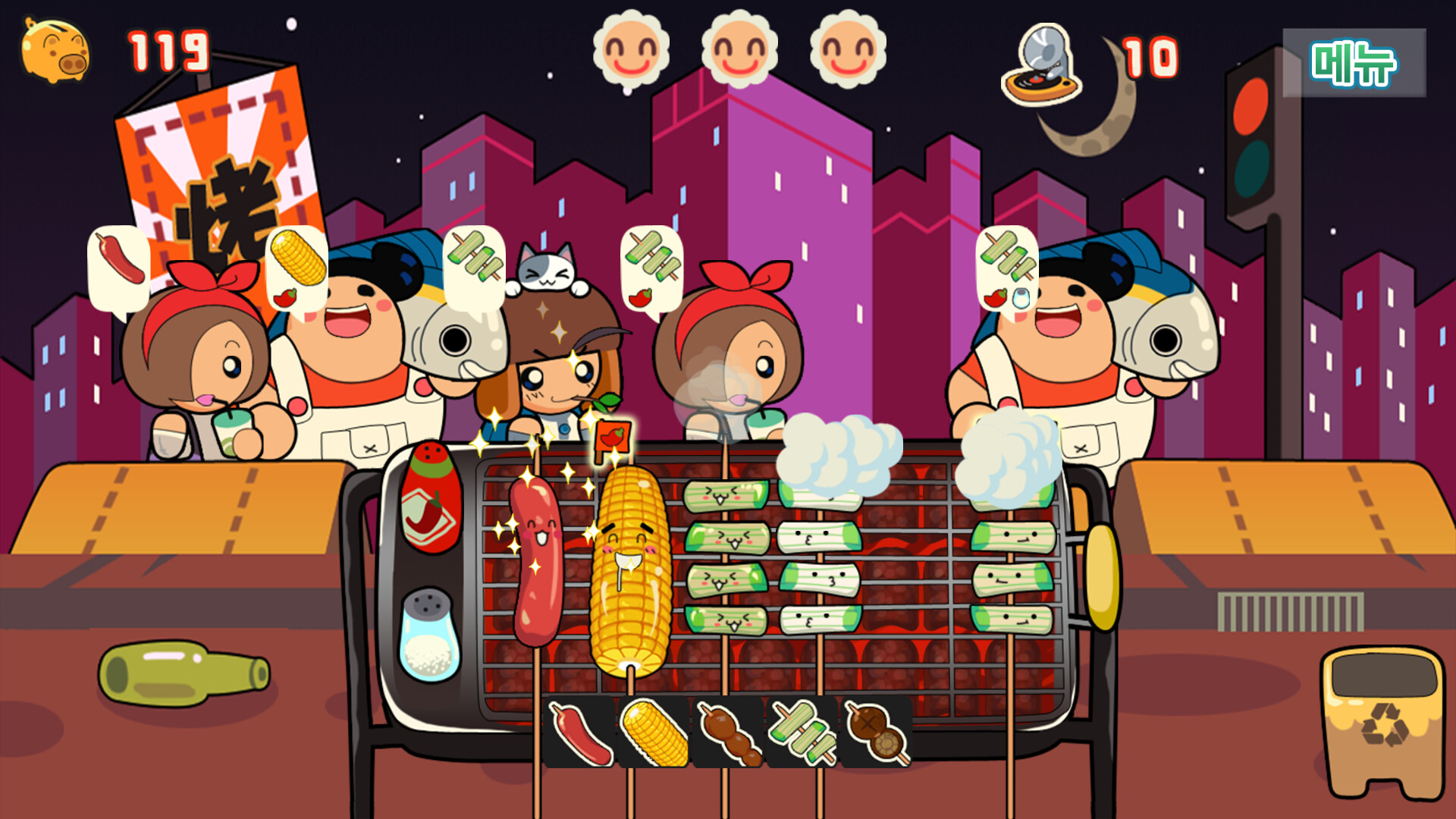 당신의 임무는? 배고픈 손님들을 행복하게 하는 것! 꼬치, 소시지, 치킨윙 등을 완벽하게 그릴해야 합니다. 타이밍이 중요해요—너무 덜 익거나 태우면 손님이 떠납니다!