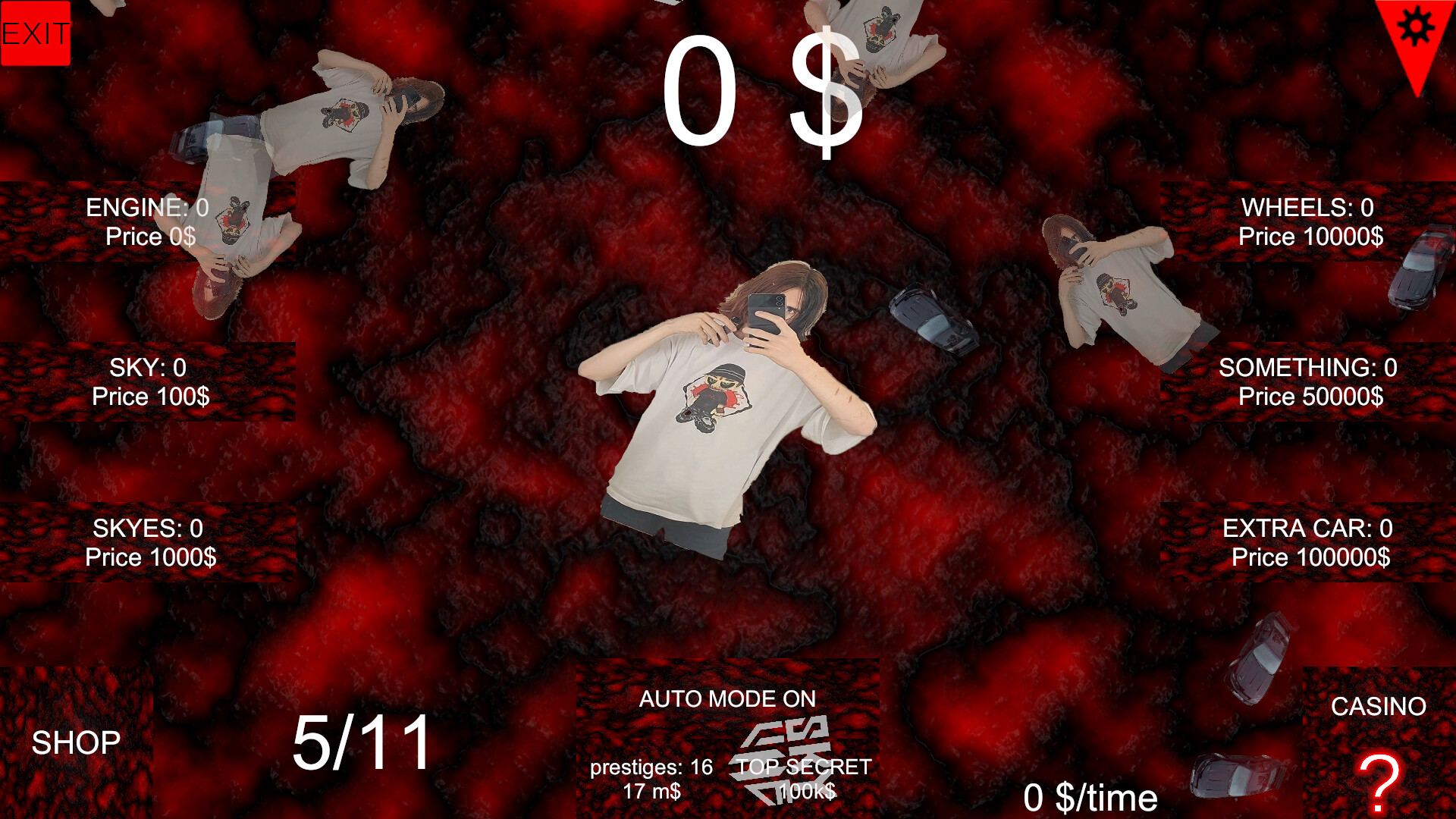 Buy upgrades (Engine, Sky, Skai, Wheels, Something, Extra Car)