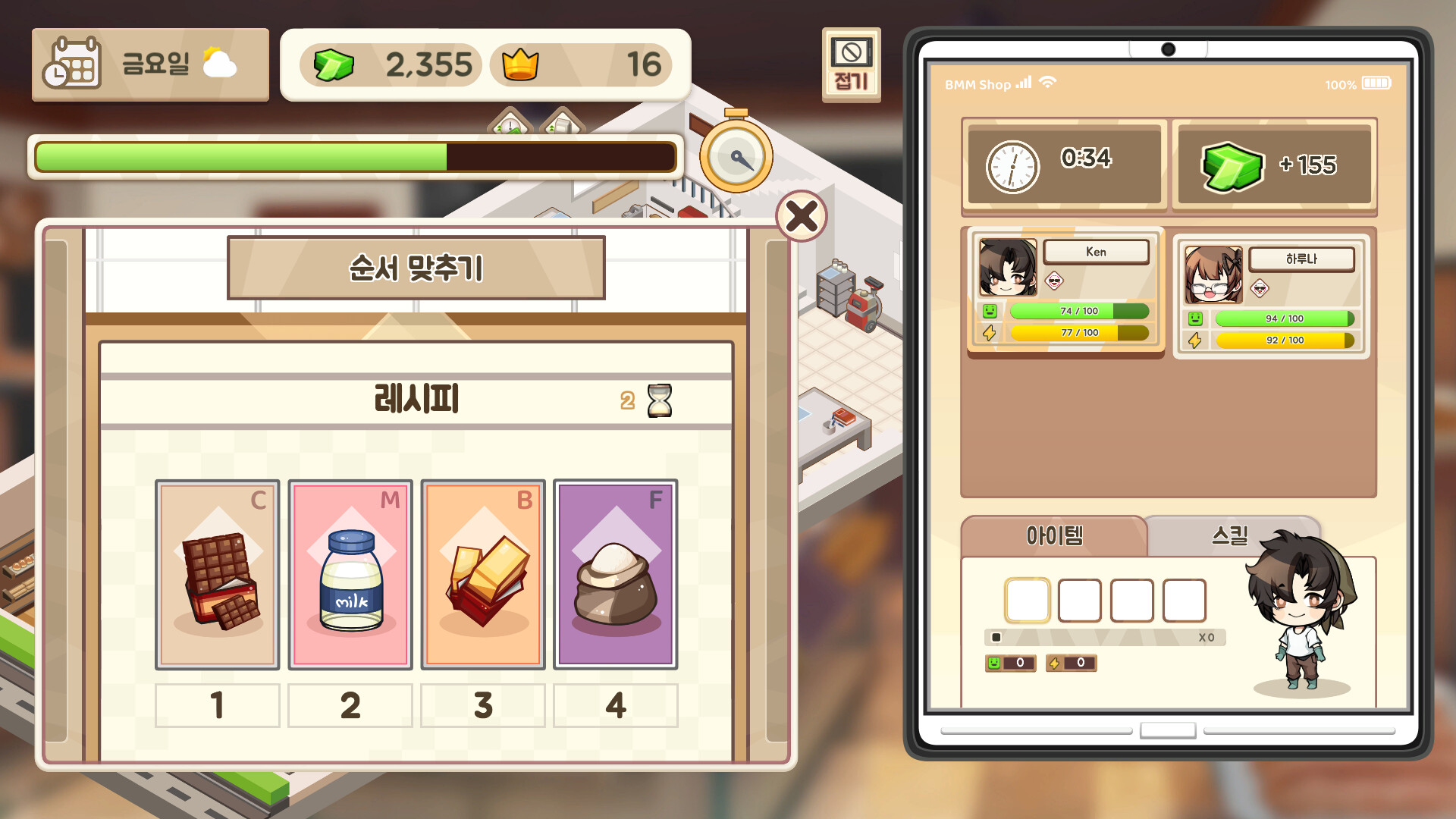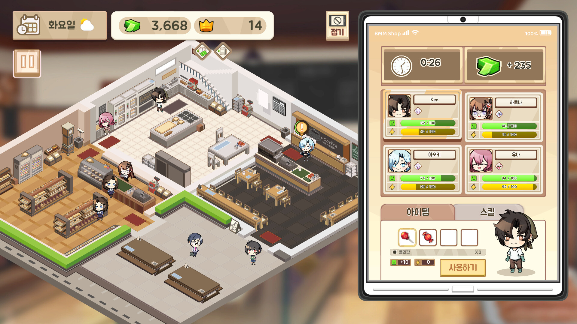 가게를 운영하는 동안, 여기저기에서 다양한 작은 일들을 수행할 수 있으며, 이를 통해 효율성을 높이고 능력치를 강화할 수 있습니다.