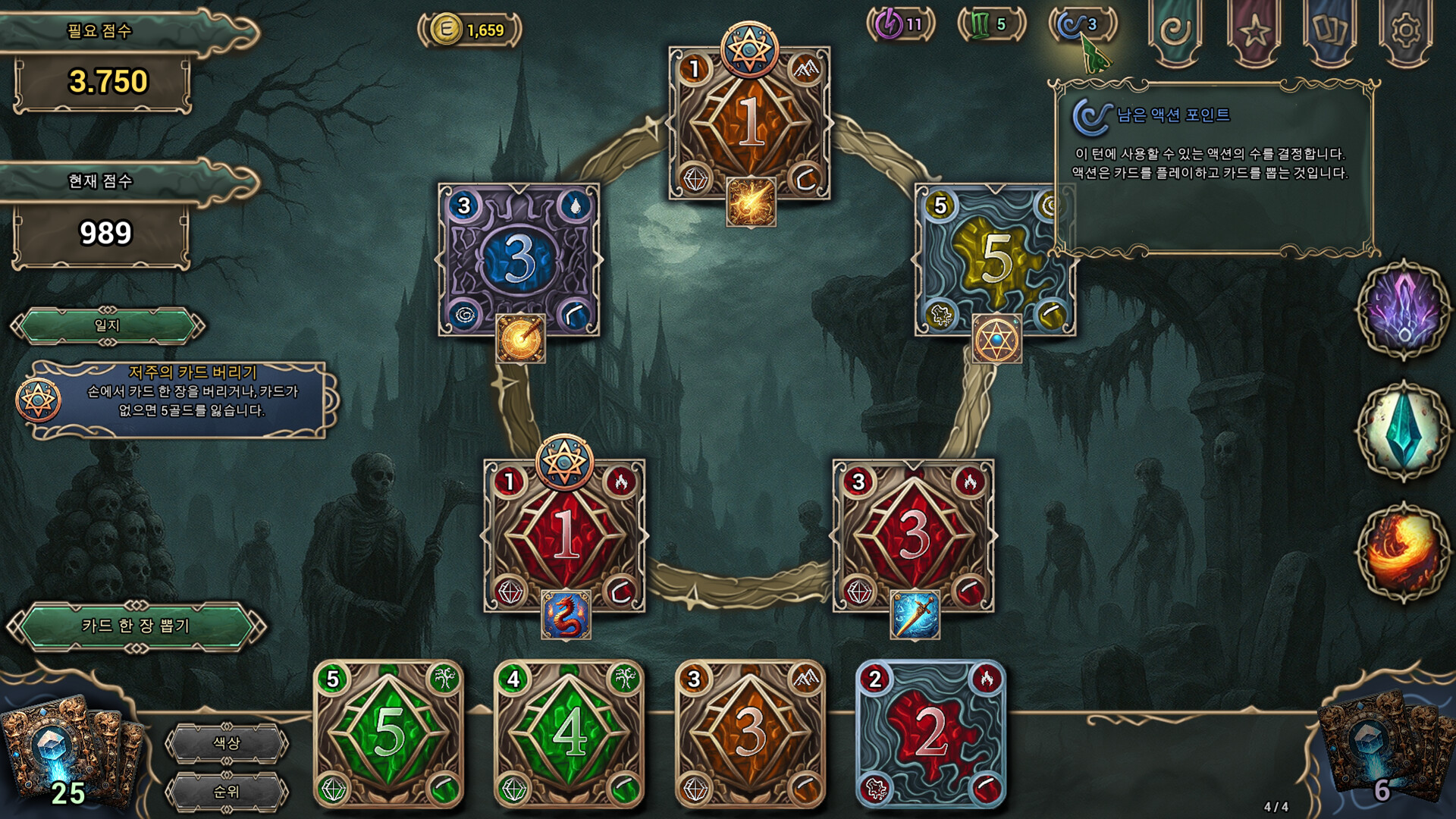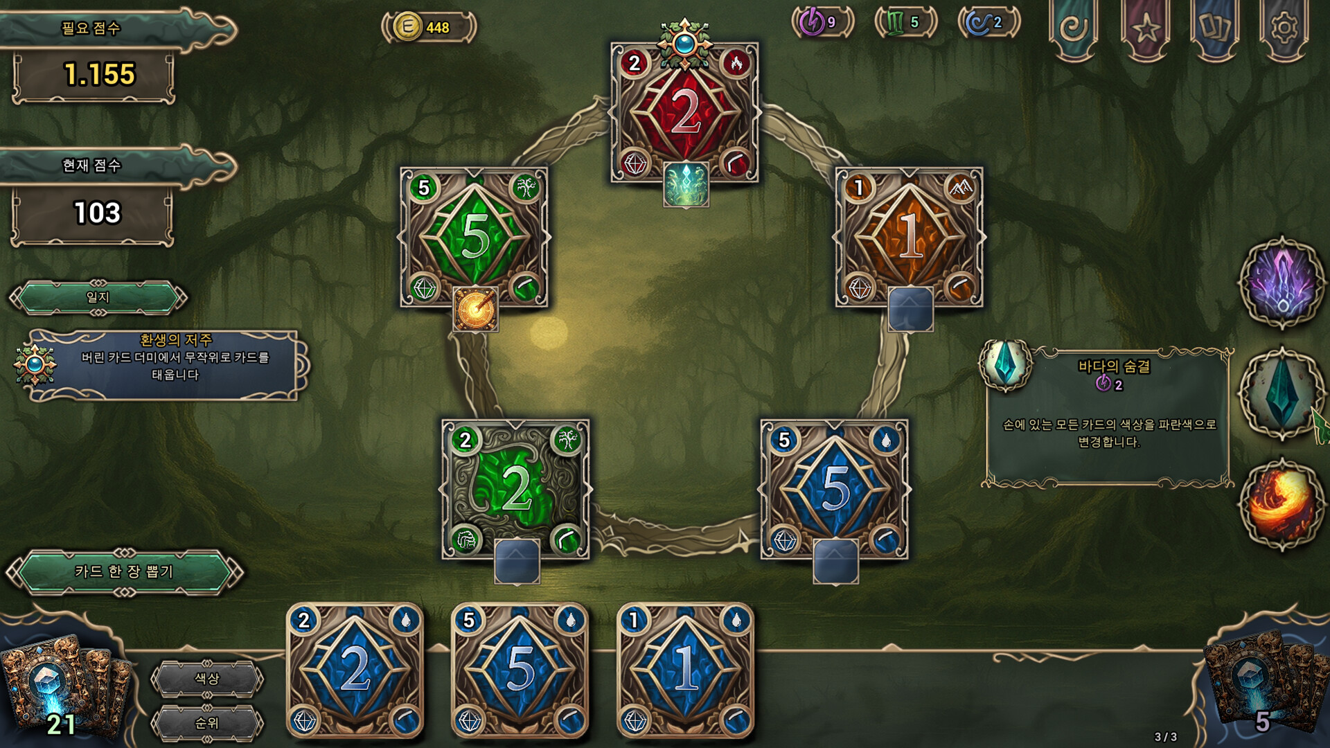 원 메커니즘 - 카드를 보드의 원형 5개 슬롯에 배치하고, 생성된 모든 배열의 점수를 계산합니다.