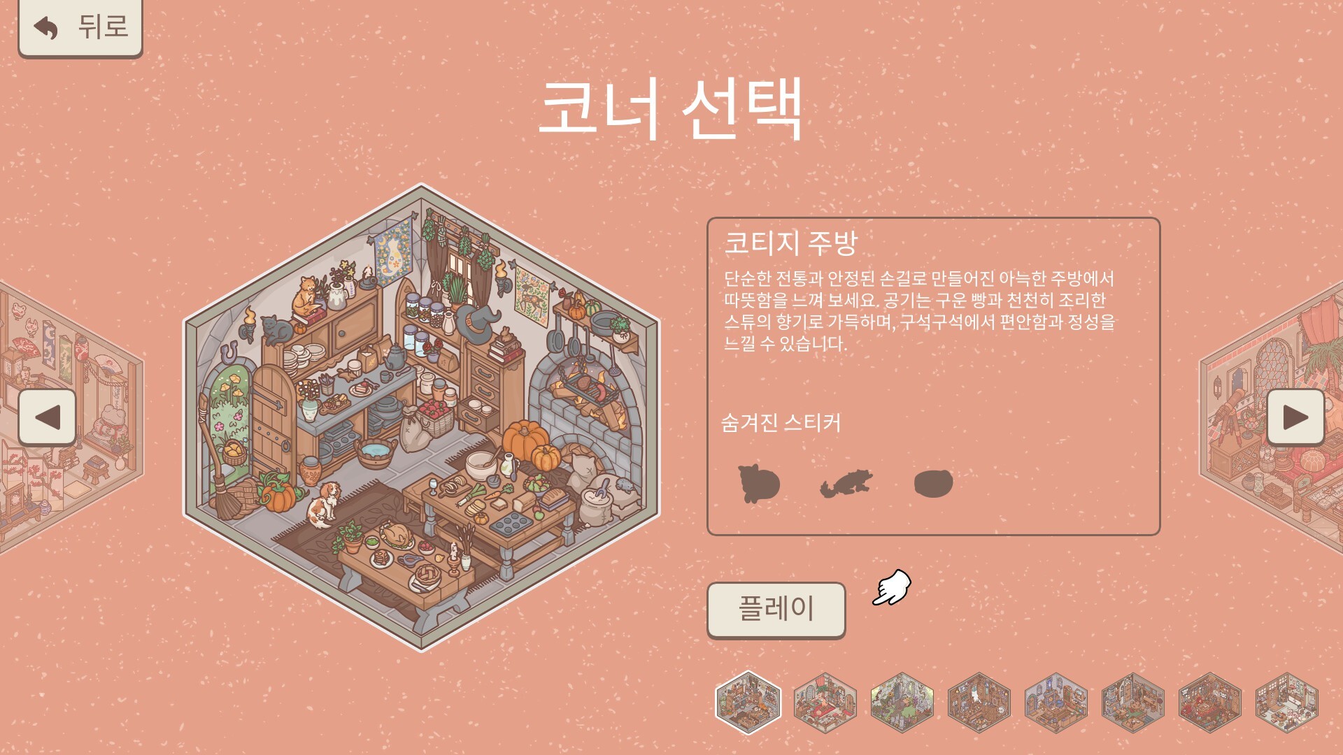 이곳은 여러분이 직접 꾸미는 세계! 상상력을 최대한 발휘하여, 아무것도 없던 쓸쓸한 공간을 왁자지껄 활기 넘치는 세상으로 바꿔 보세요! 편안한 경음악에 몸을 맡긴 채, 낡은 가구와 졸린 동물, 장신구 등 여러 스티커를 붙이다 보면, 어느새 마음이 편해지고 만족감을 느끼게 될 거예요. 또한, 다양한 새 조합과 배치를 시험해, 감춰진 스티커를 찾아내 보세요.