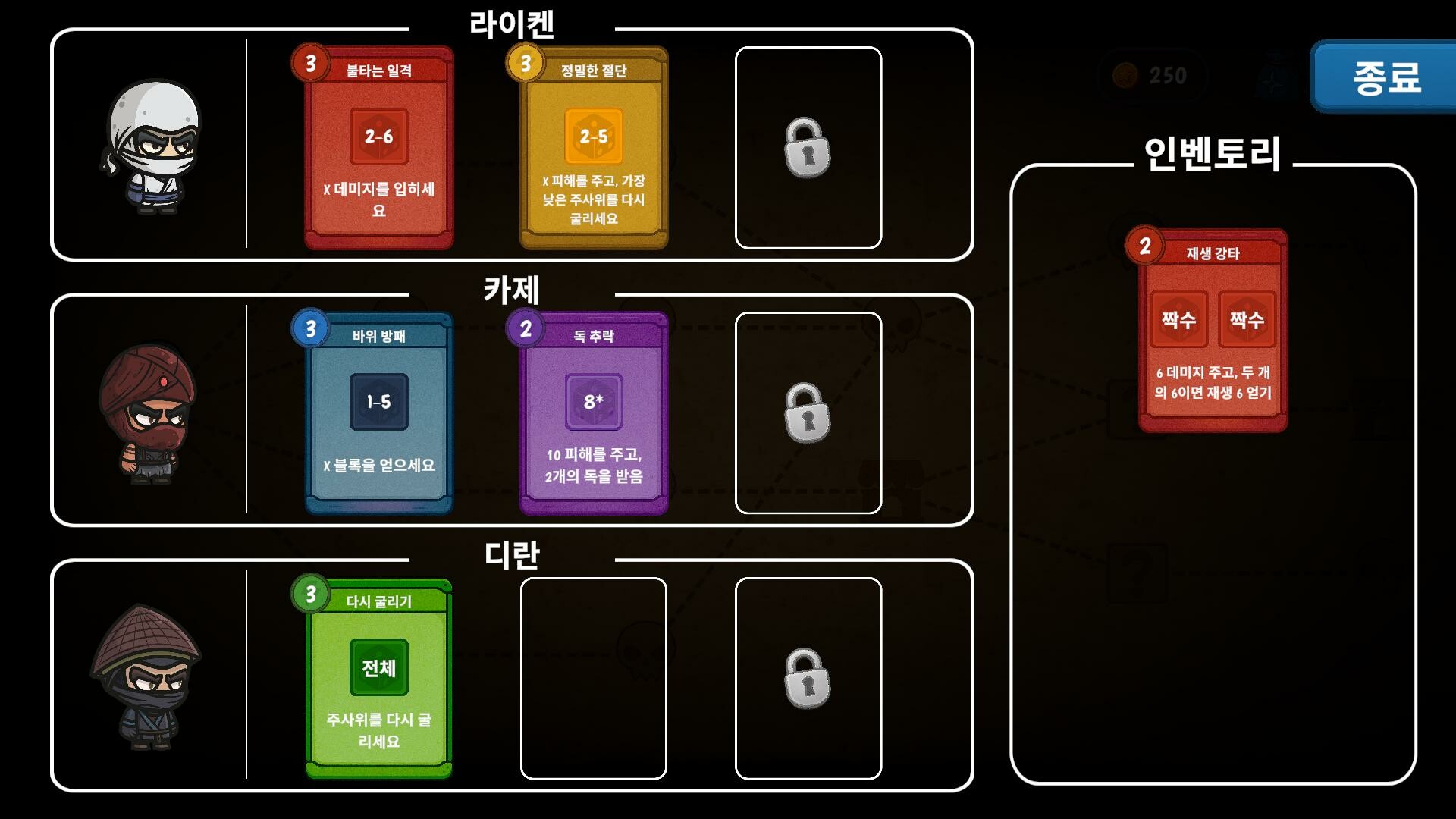인벤토리 로드아웃 시스템: 각 닌자에게 인벤토리에서 강력한 카드를 배치하세요. 슬롯 수는 제한되어 있으며, 카드 효과는 다양하므로 세심한 계획이 전투에서 승리하는 열쇠입니다.