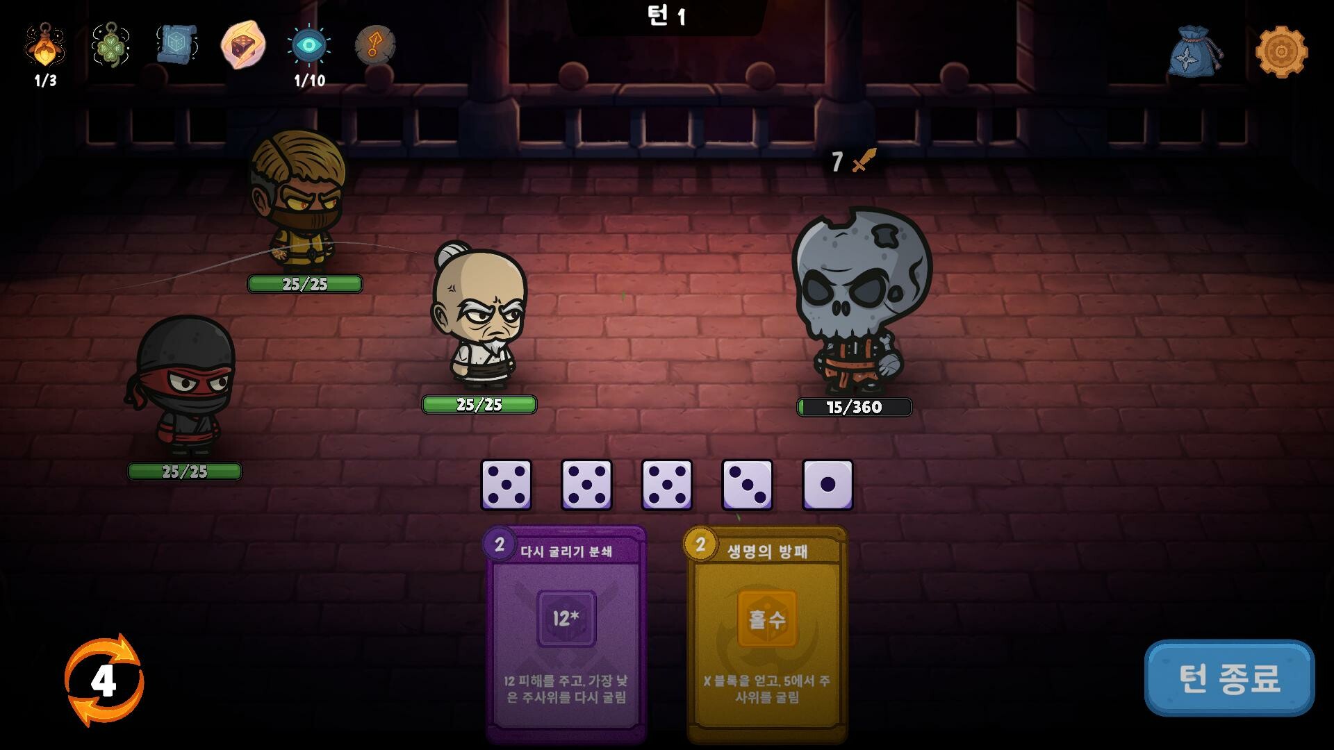 주사위 기반 전투: 매 턴마다 주사위를 굴리고, 나온 숫자에 따라 인벤토리의 카드를 활성화하세요. 홀수, 짝수, 특정 숫자에 맞춰 강력한 능력을 발동하며, 똑똑한 주사위 관리로 적을 무찌르세요!