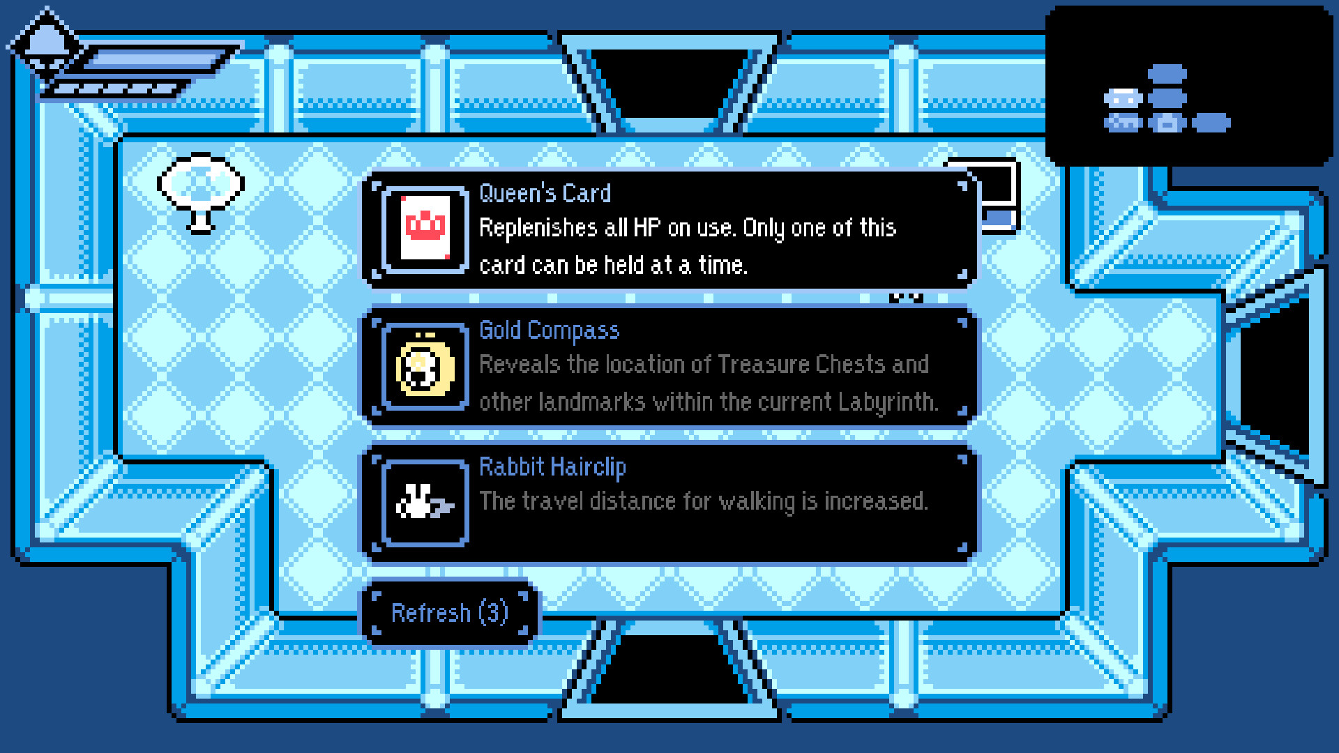 미궁 내의 보물 상자에서는 무작위로 3개의 아이템이 제시되며, 이 중 하나를 선택할 수 있습니다. 이 아이템들은 패시브 효과나 원거리 특수공격 등을 포함한 독특한 능력을 제공합니다. 슈트 카드 는 5장 세트로 구성되어 있으며, 사용할 때마다 MP를 1칸 소모합니다. MP는 적에게 근접 공격을 가함으로써 회복됩니다.
