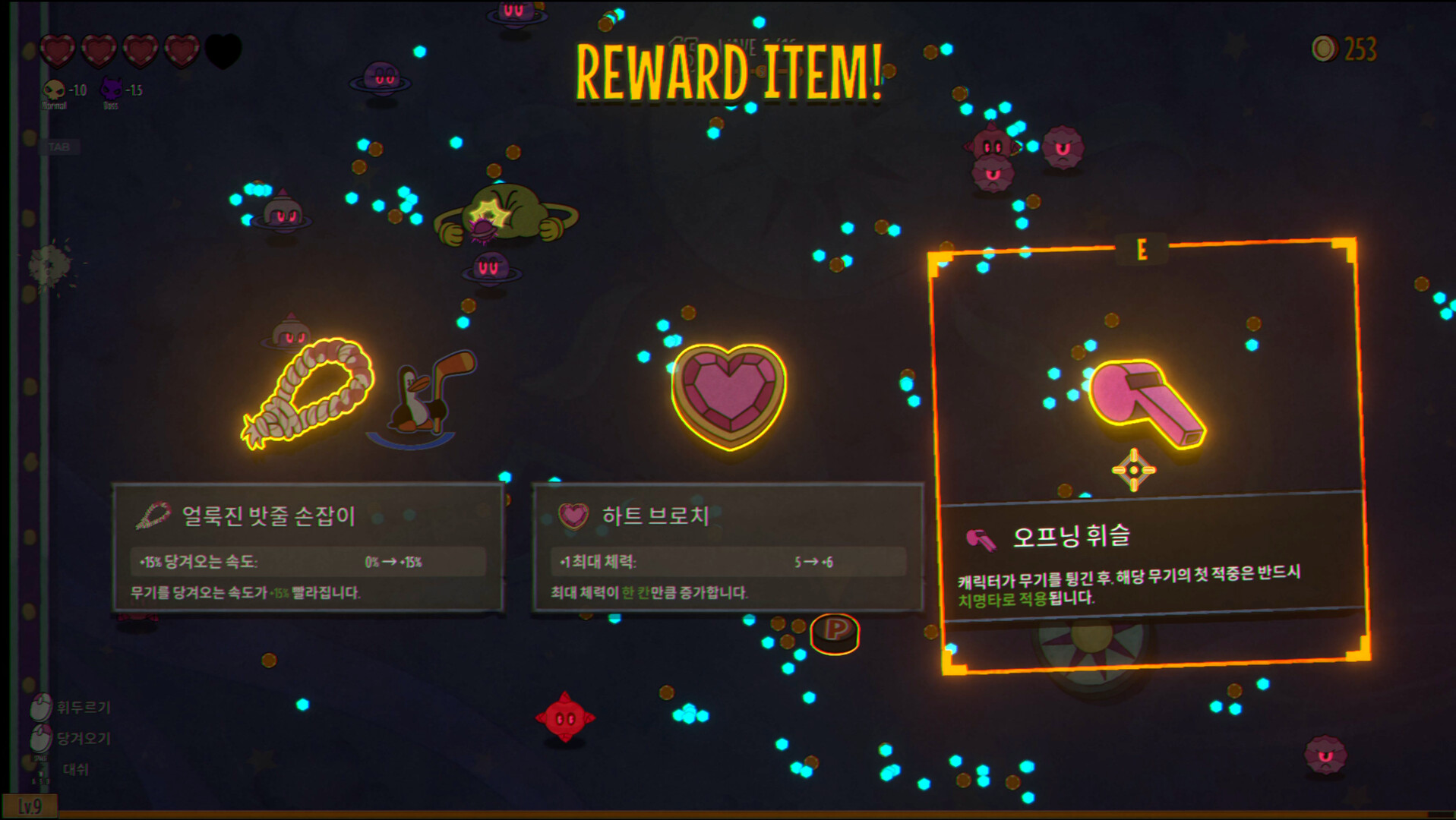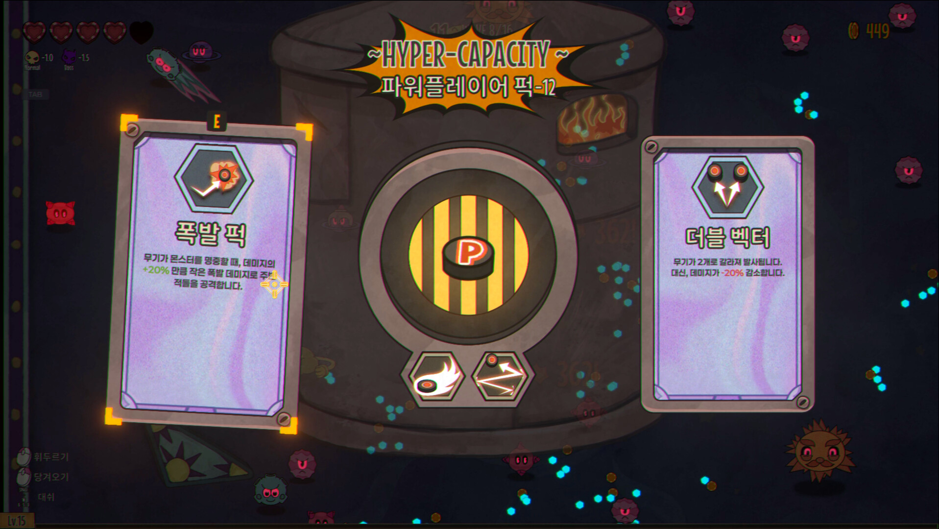직접 타격이 아니라 물리를 이용한 공격이 키 포인트입니다. 하키퍽, 총(던지는 총입니다), 이어폰(이것도 던져요), 심지어 복어까지…! 다양한 무기들을 튕겨보세요.