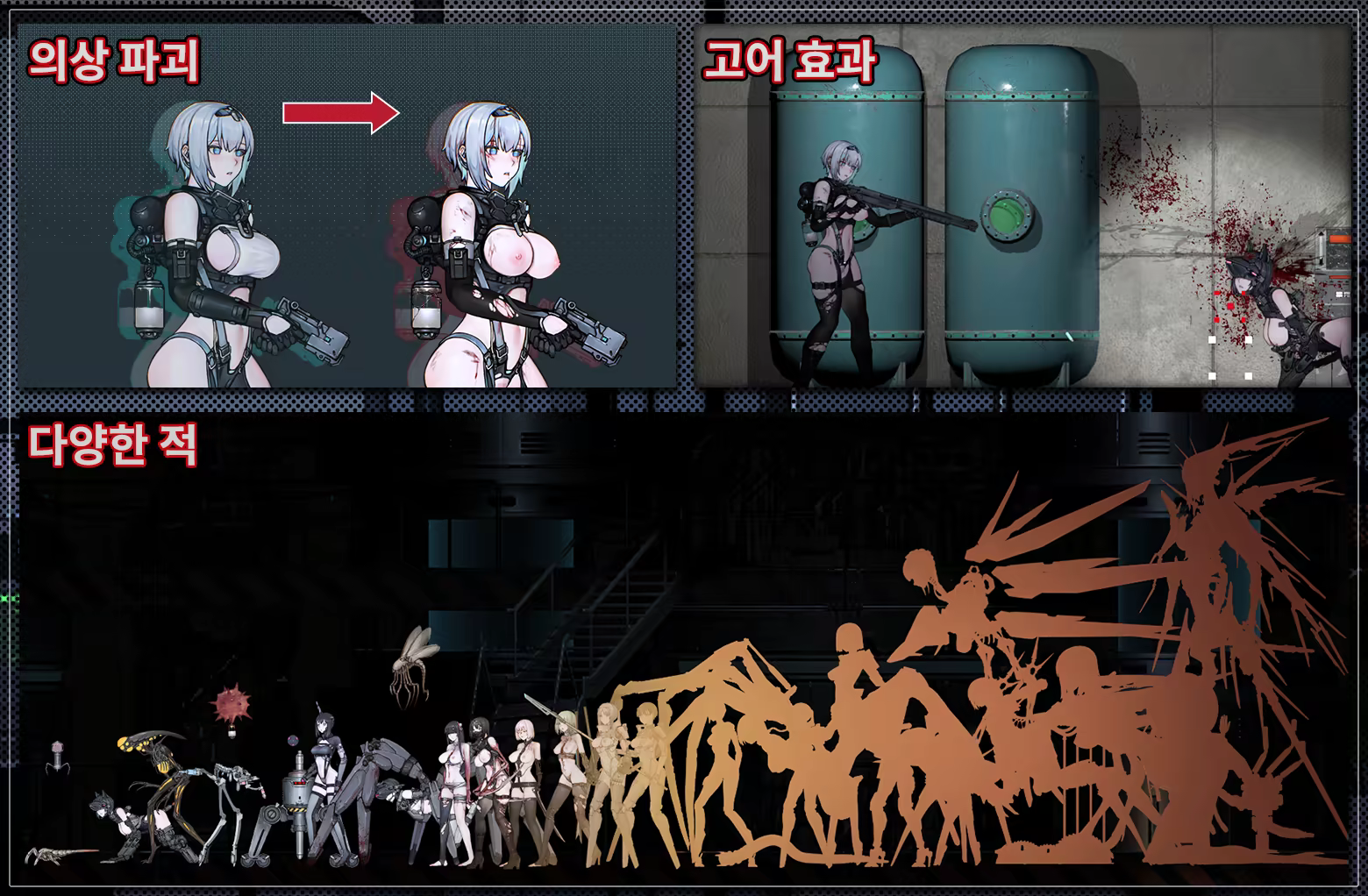 전투 중 적에게 피해를 보면 서서히 의상이 파손되는 탈의 시스템을 탑재했습니다. 공격이 적중하면 무작위로 사실적인 피가 튀기는 효과가 발생하여, 액션을 더욱 생생하게 느낄 수 있습니다. 적에게 패배할 경우 그에 상응하는 독특한 처형 애니메이션이 재생되며, 사망 후 수집 가능한 데스 카드를 획득하게 됩니다.