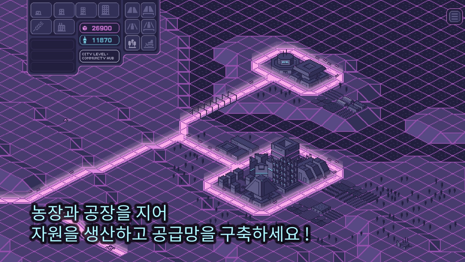 이 게임은 SimCity 2000과 같은 고전 명작에서 영감을 받은 레트로 감성의 도시 건설 게임으로, 찬란한 네온빛 사이버펑크 세계 속에서 새롭게 재해석되었습니다.