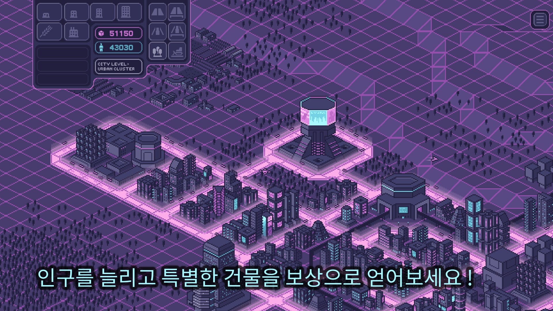 인구와 자원의 균형을 유지하고, 특별한 건물을 잠금 해제하며, 도시가 성장할수록 레벨을 올려보세요.