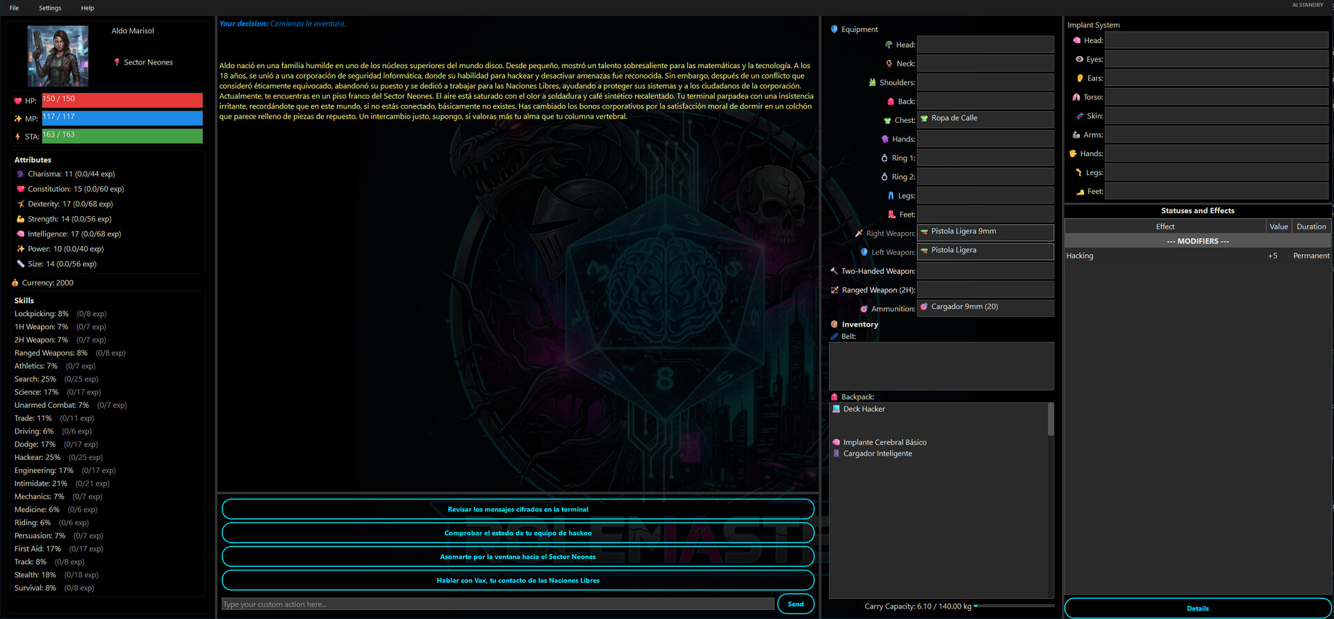캐릭터 시트에는 능력치, 백분율 기반 기술, 생명력, 마나, 상태, 장비가 포함됩니다.