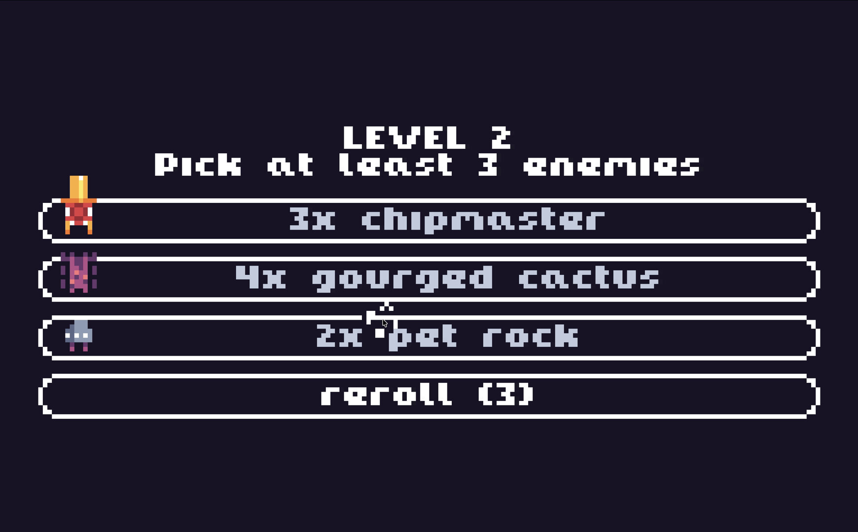 mallow is heavily inspired by nuclear throne by having quick action paced runs and chaotic challenging gameplay. the game is quite difficult and is very punishing. the main mechanic is the ability to select enemies as well as upgrades. for every upgrade you select you must select an enemy. this is my first game as a solo dev (i do everything except the music) and student so the project might be a bit rough.
