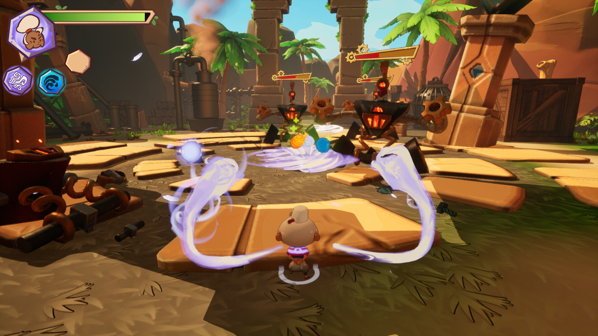 As the last living line of defense, you'll use your powerful elemental arms to push, pound, and punch the robots who are polluting the ether and imprisoning the island spirits known as the Goubies. They don't take kindly to your strong winds, ruthless waves, and furious fire fists.
