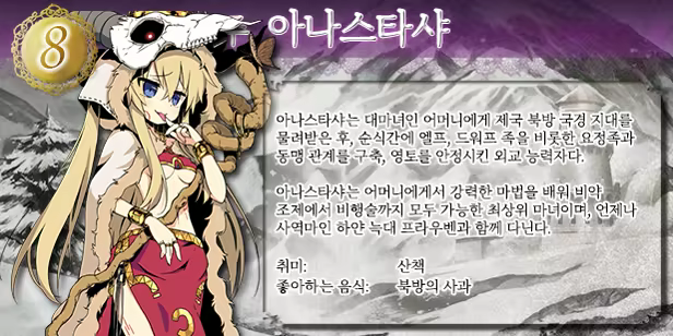 제국의 끝자락에 자리 잡은 북방 한계령은 야심찬 마녀 공주 아나스타샤의 눈 덮인 영지입니다. 강력한 마녀이자 전 황제 헤럴드의 애인이었던 그녀의 어머니에게 땅을 물려받았고, 아나스타샤에게 흐르는 황족의 피로 인해 계승권 경쟁에 참여하게 되었습니다. 강력한 환각 마법에 기반해, 그녀는 황위를 차지하기 위한 한 걸음을 내딛습니다...