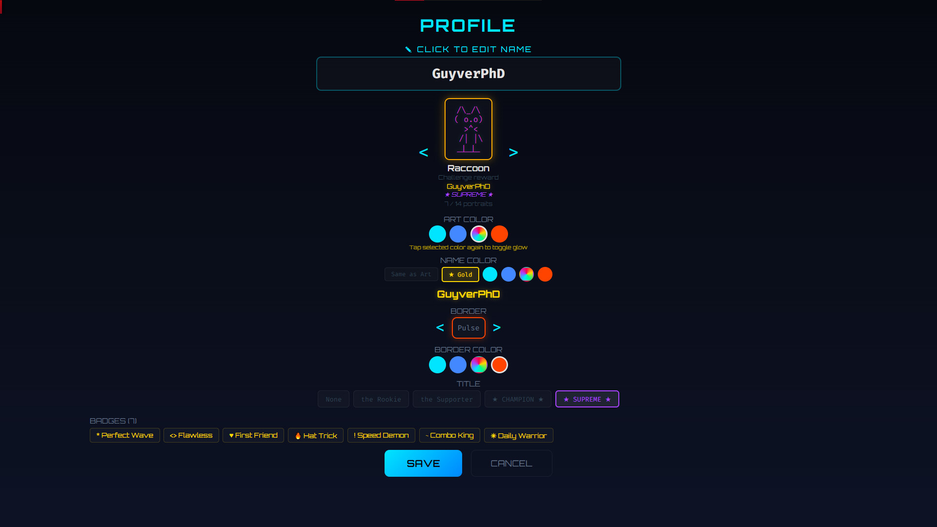 Steam players automatically receive the Supporter Pack — a collection of premium cosmetics including rainbow art colors, the Supporter portrait frame, exclusive titles, and gold name color. It's our way of saying thanks for buying the game. Want to go further? The Ultimate Pack unlocks the Apex Dragon portrait, Supreme gradient frame, Inferno color, and the exclusive ✨ Glow Mode that adds a pulsing brightness effect to any color you choose.
