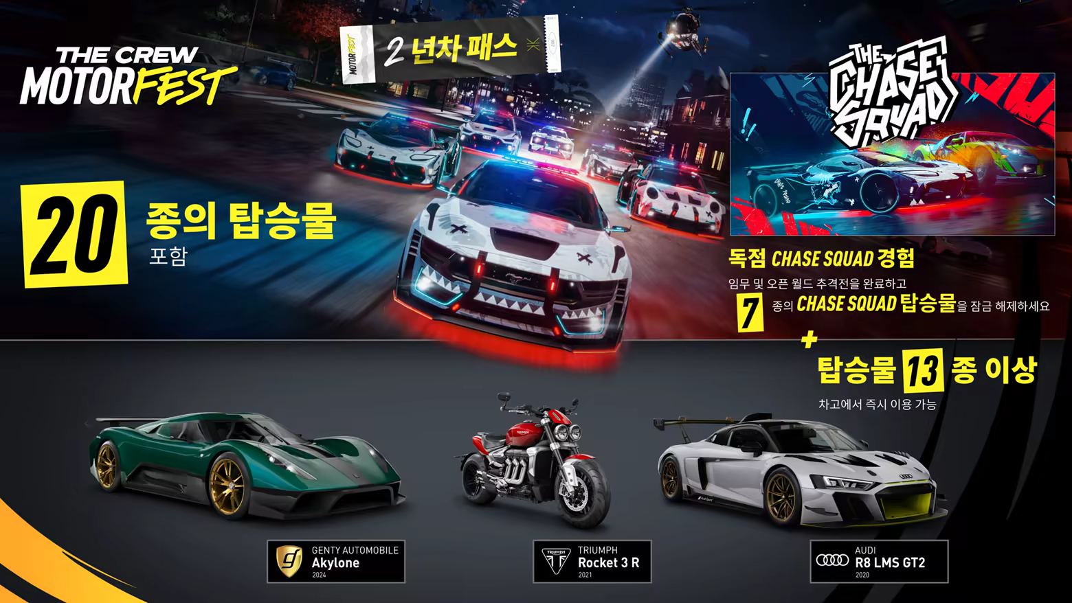 - Chase Squad: 신규 PvE 콘텐츠 및 오픈 월드 도전과제를 즐겨 보세요. 고유의 외형을 지닌 6종의 차량과 1종의 헬리콥터가 포함된 Chase Squad 전용 탑승물 총 7종을 잠금 해제하세요.