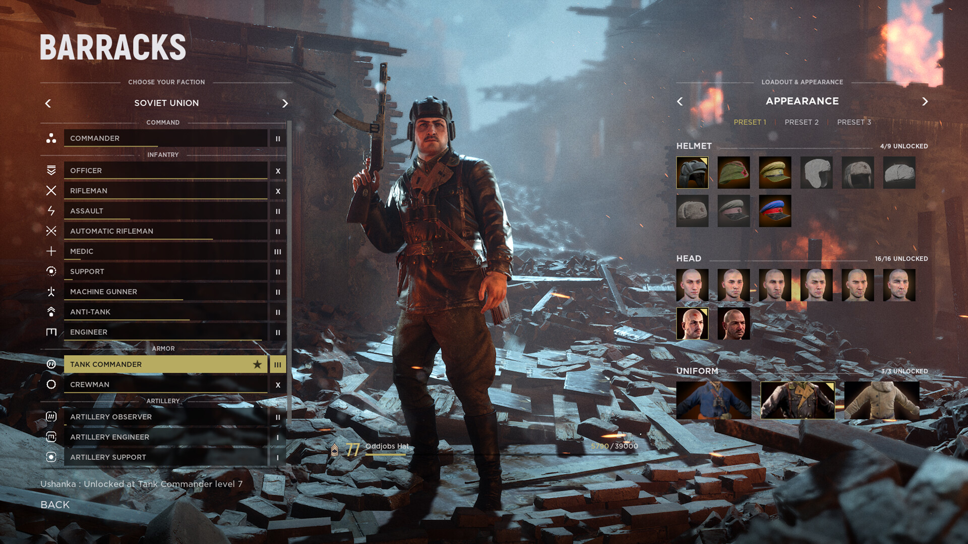 보병 제복, 장갑 제복, 지휘관 제복, 헬멧