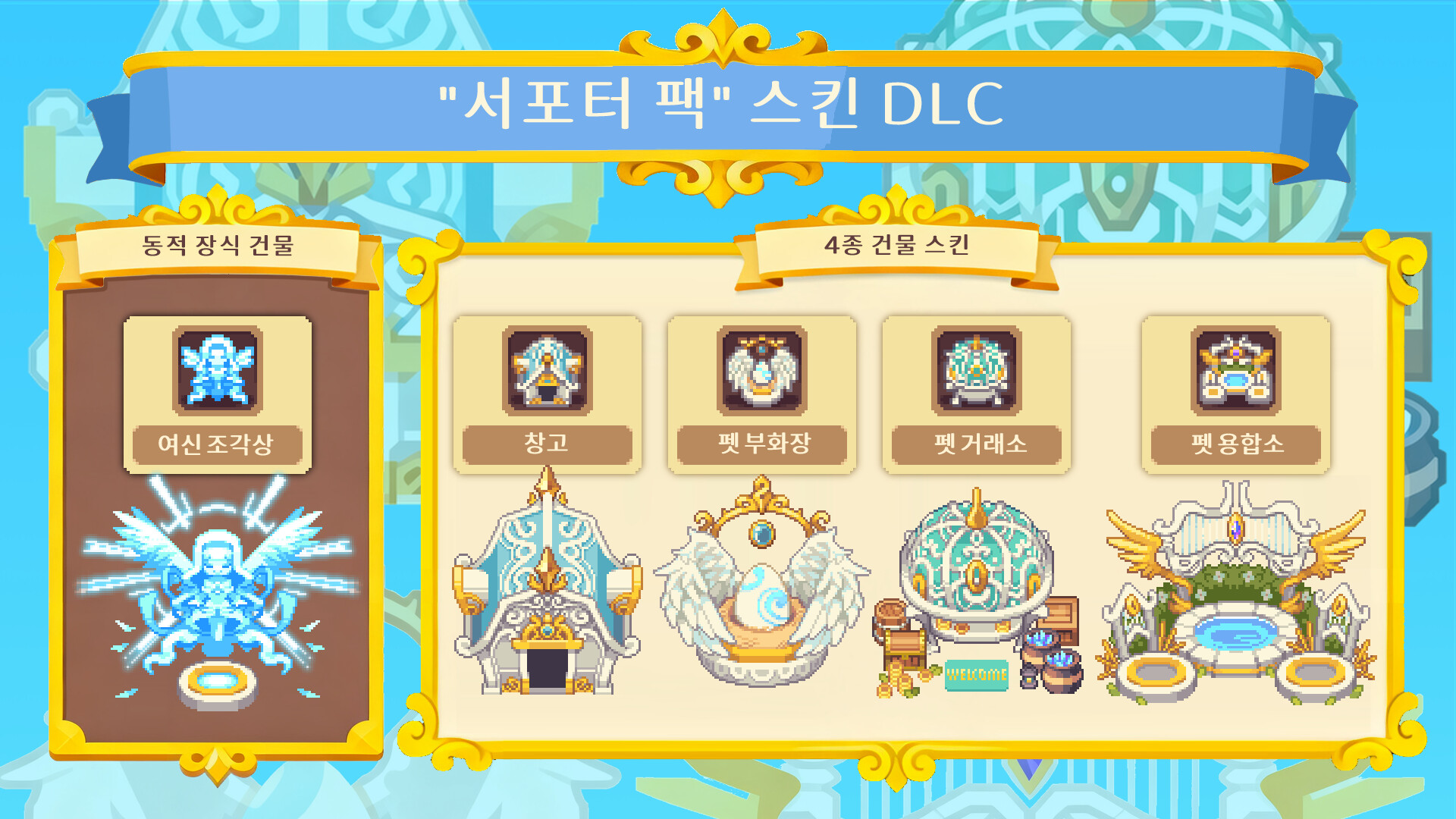 스킨 변경 방법: 서포터 스킨 DLC를 구매한 후 → 건물 클릭 → 오른쪽 상단의 스킨 버튼 클릭 → 스킨 변경