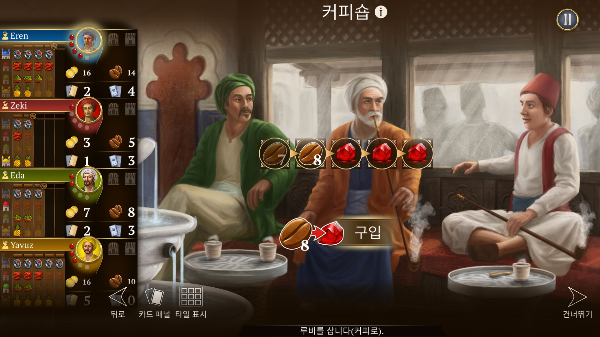 - 커피 상인과 마주치면 모은 자원 또는 리라를 교환합니다.