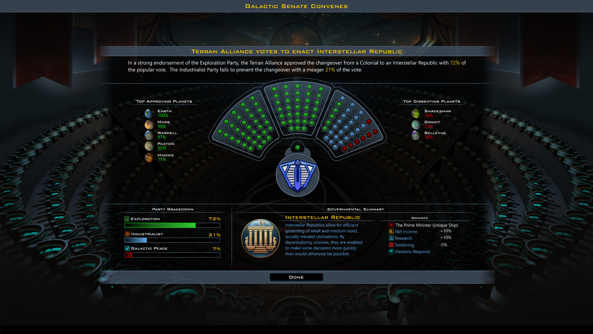 정부 형태를 선택하십시오. 인자하게 다스리든, 철권으로 다스리든 선택은 당신 몫입니다! 20가지의 정부 형태에서 마음에 드는 것을 선택하고 문명을 위대한 미래로 이끄십시오. 통치 형태에는 각각 장단점이 있습니다. 민주주의 정부를 수립할 수도 있지만, 다음 선거에서 패배하고 싶지 않다면 민심을 얻어야 합니다. 또한 소유주 귀족 정치를 선택하여 노동자 계층을 노예로 삼을 수도 있고, 성간 금권 정치를 선택하여 사람들의 의견 따위는 무시하고 회사를 통해 우주를 지배할 수도 있습니다! 물론 폭동이 일어날 가능성도 있겠지만, 충분히 대처할 수 있을 테니까요. 아닌가요?